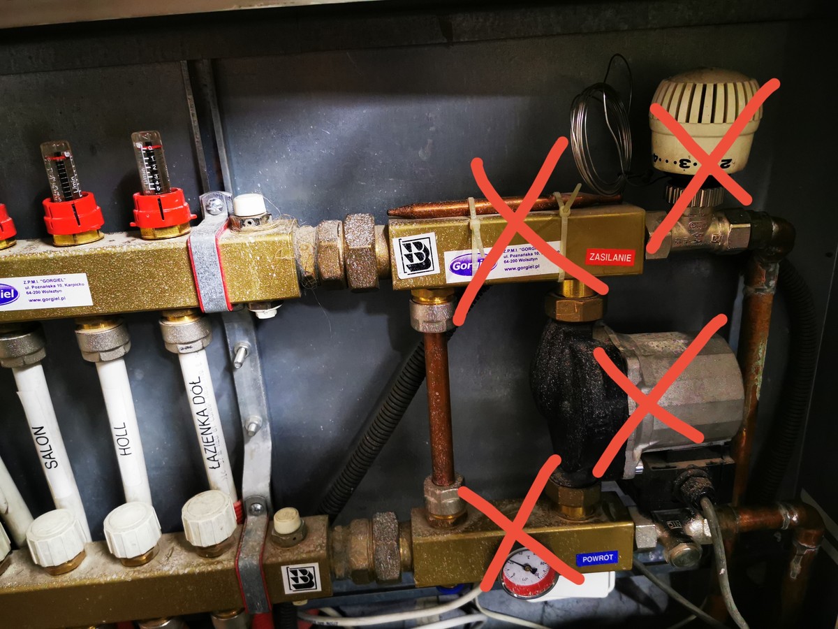 5. Witam, w zeszłym tygodniu założono mi Pompe Ciepła i panowie poszli na łatwiznę jeśli chodzi o zasilanie podłogówki. Całą kotłownie zrobili ładnie, a szafkę gdzie jest rozdzielacz od podłogówki olali - w rezultacie ostatnie 5 dni miałem zimną podłogę. System działa na zasadzie Bufora, na wyjściu którego zamontowano: 2 pompy obiegowe: - ta z lewej zasila obieg podłogówki - ta z prawej zasila grzejniki Następnie ciepła woda wpada do rozdzielacza, który został po kotle na paliwa stałe i z tego co pamiętam, to takie rozwiązanie tworzyło mały układ zamknięty, gdzie woda krążyła w rurach od podłogówki a jak się studziła to RTL dopuszczał ciepłą wodę z kotła... chociaż nie jestem pewien czy w pełni rozumiem zasadę działania, w każdym razie u mnie ten rozdzielacz wygląda tak: Instalator wpierw kazał wyłączyć pompę na rozdzielaczu - ale podejrzewam, że woda wybierała najmniejszą linie oporu i zamiast trafiać na pętle to przepuszczała i ciepła woda zamiast trafiać na pętle to wracała. W weekend przepływ pompy z pompki za buforem ustawiłem na auto, otwarłem do połowy bajpas i załączyłem tą pompkę przy rozdzielaczu i temperatura w pomieszczeniach zaczęła powoli rosnąć. Instalator polecił zakręcić bajpas (który ponoć reguluje przepływ) i zaproponował wywalenie tej pompki przy rozdzielaczu i zaślepienie tych miejsc. Nie do końca jestem przekonany czy to jest dobry pomysł, bo jest tam ten RTL, który jak miejsce pompy obiegowej będzie zaślepione to odetnie mi układ kompletnie jak woda będzie za ciepła. RTL pewnie wtedy musiałby być otwarty na max, ale znowu musiałbym ograniczyć temp. zasilania i na grzejniki szło by max 30C co w zimie nie wystarczy. Bardzo was proszę o poradę, co mogę na tą chwilę zrobić, żeby układ działał efektywnie.