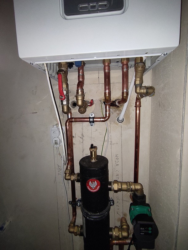 Sprawa się rozciąga, bo najpierw była walka żeby to zrobił wykonawca dewelopera (dostałem pismo, że instalacja wykonana jest prawidłowo) Później zacząłem szukać ludzi na własną rękę, co też trochę zajęło. W miedzy czasie wykańczam dom, wiec sporo tych tematów na głowie. Jeśli chodzi o filtr to obecny wykonawca powiedział, że nie jest potrzebny bo jest na powrocie przed kotłem jeden filtr i to wystarczy. (zdjęcie) Czyli wychodzi na to, ze nie miał racji? Wspominałem także o zaworze odcinającym przed pompą, to stwierdził, że nie jest potrzebny, bo przy wymianie pompy trzeba zlać tylko wodę z kotła i sprzęgła. Jaki może być powód, że ten zawór strzela? Najprościej będzie go usunąć? -