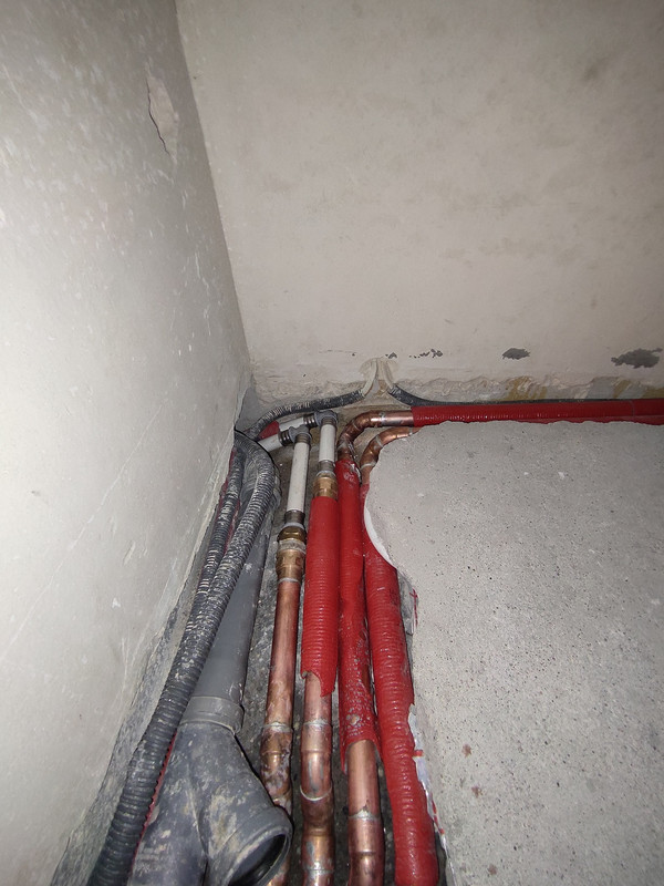 Pętli jest 14 w dwóch rozdzielaczach (8 i 6). Rury teoretycznie jest 1100m w sumie. Najdłuższa pętla 88m. Rury pex 16, teoretycznie co 15cm. Ogrzewana powierzchnia 120m (w tym garaż gdzie rury są co 30cm). Jednak są to dane od wykonawcy dewelopera, których doprosić się nie mogłem wiec jest duża szansa, że nie są prawdziwe. Jedyne czego jestem pewien to poprawek które zrobiłem, a wiec wymianę rur zasilających na miedz 28 do rozdzielacza na piętrze, oraz połączanie się miedzią 28 z PEX-26 idącą do rozdzielacza na parter. Dodatkowo dodane sprzęgło i pompa. -