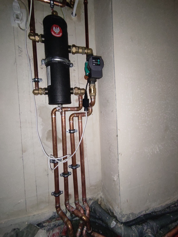 Przelałem ponownie całą instalacje wpuszczając wodę z kotła oraz ponownie każdą pętle przez zawór w rozdzielaczu. Rezultaty: 1. Rozdzielacz parter - rotametry stabilne - nie falują 2. Rozdzielacz piętro - większość rotametrów stabilnych - niektóre delikatnie falują, ale już nie hałasują. W tym rozdzielaczu mam inny typ rotametrów, mimo tego, że belka rozdzielacza jest taka sama. Dzwoniłem do producenta rozdzielacza, twierdzi, że są bardziej czułe stąd może występować falowanie. Pozostał na ten moment jeden problem, mianowicie zawór zwrotny za pompą obiegową cały czas hałasuje - strzela, ale tylko i wyłącznie wtedy kiedy otwarte są dwa rozdzielacze. Problem nie istnieje w momencie zamknięcia któregoś z rozdzielaczy. W skrócie jak wygląda teraz instalacja po modyfikacji: Kocioł - sprzęgło - miedź 22 Za sprzęgłem miedz 28 do trójnika i za trójnikiem do rozdzielacza na piętrze. Na parter miedz 28 do trójnika, za trójnikiem dalej miedź 28 z przejściem na PEX 26 w posadzce do rozdzielacza. Dodaje zdjęcia z instalacji oraz film z hałasu jakie generuje zawór zwrotny. Czy to problem z zaworem zwrotnym? Czy może jeszcze gdzieś jest inny błąd w instalacji? Zanim zgłoszę to wykonawcy, chciałem zapytać jaki może być potencjalny problem.