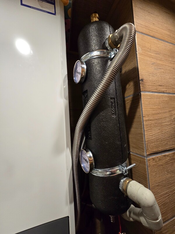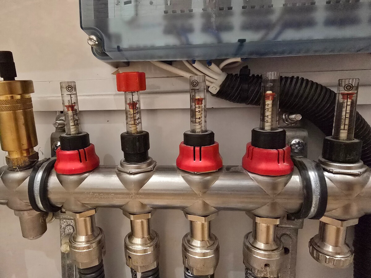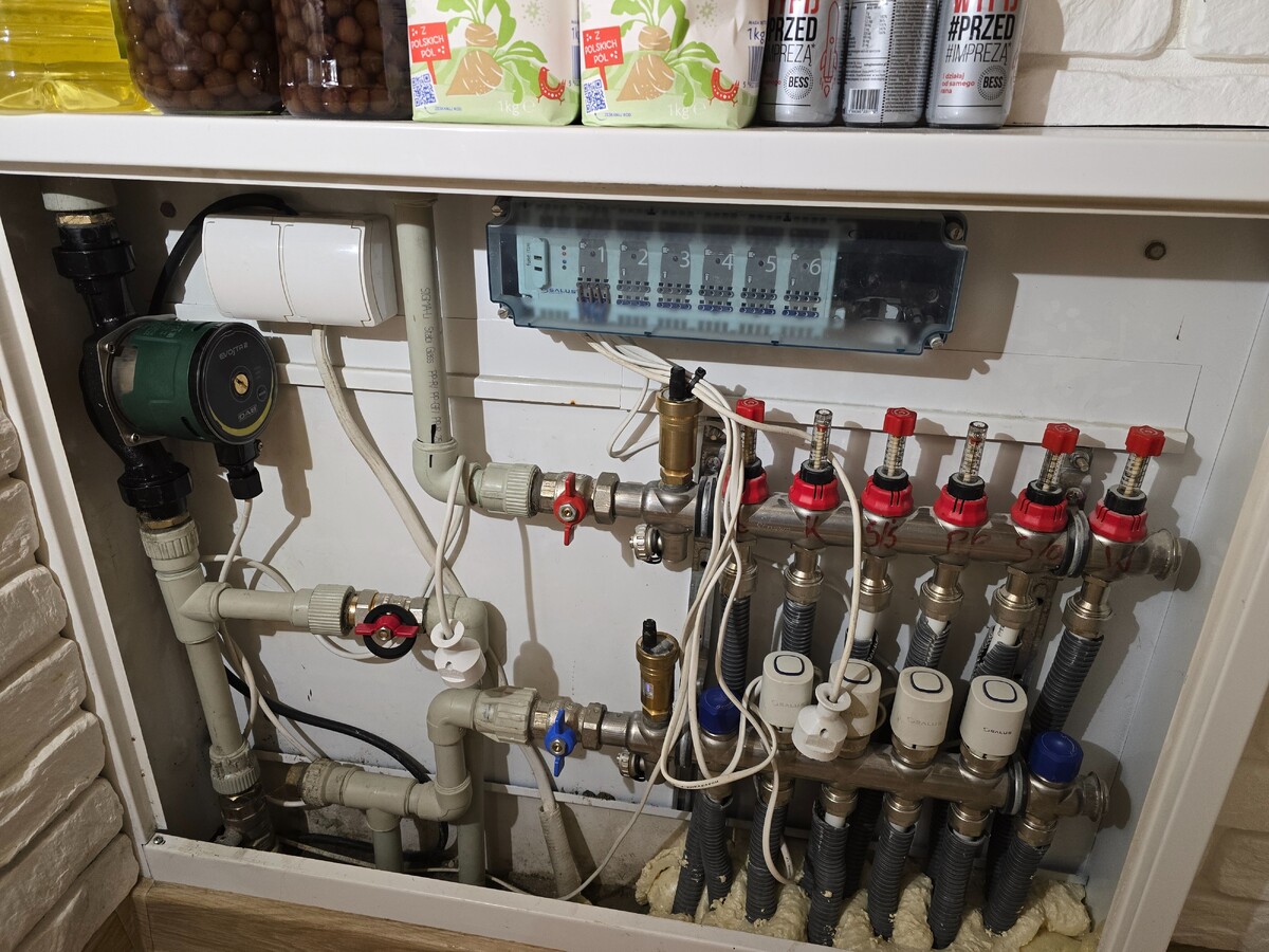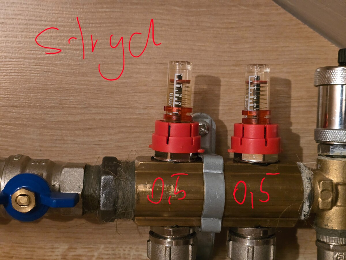 Przepuscilem pompy na pełną, słychać jeszcze że szumi i powietrze gdzieś uchodzi. Wydaje mi się że ograniczeniem i tak będą tak jak mówiliście, przekroje rur. Na dole pompa chodzi w trybie podlogowki na 1 biegu, na piętrze chodzi na pełnej na 3. Przy teoretycznie wszystkich otwartych pętlach każda ma około 1l /min. Ze sprzęgłem było trochę druciarstwa ale finalnie się udało. Jeszcze się upewniając: tam gdzie na obudowie jest KOCIOŁ to na górze rura która jest podłączona jest podłączona do zaworu zasilajacego wychodzącego z pieca, a ta na dole, od zaworu powrotu z pieca do sprzęgła. Wodę chwilowo na piecu ustawiłem na 40. Zgaduje, że przy wszystkich otwartych pętlach więcej niż 1l/min nie uzyskam.😅 Jeżeli dobrze rozumiem to sprzęgło też powoduje że mimo grzania wody w kranie to nie przestaje działać obieg wody. Wcześniej po odkręceniu wszystkie rotametry wskazywały 0, teraz nawet nie drgną. Ogólnie trochę jak się układ odpowietrzyl to na dole już jest przepływ około 2 l/min a na górze 1 l/min. Pompa na piętrze mimo to szumi jeszcze i słychać jak się przelewa woda z powietrzem.