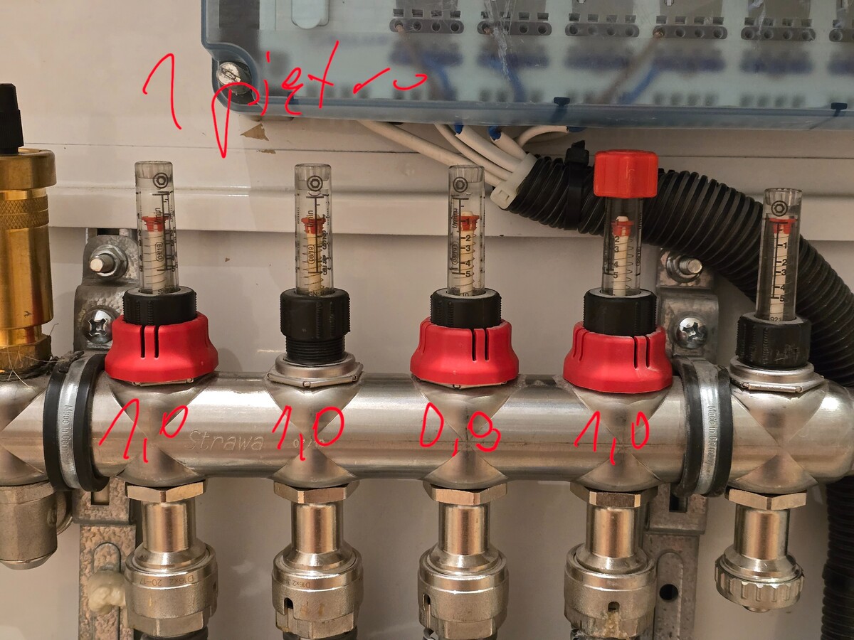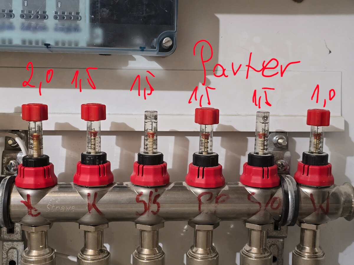 Mamy 23.45 i aktualnie: 1. Na parterze przepływy ustawiłem na A) 1.5 l/min na każdą pętlę w salonie B) 1 l/min na łazienkę bo jest dosyć mała C) 2 l/min na wiatrołap bo tam straty ciepła największe. 2. Na piętrze każdy pokój w tym łazienka osiąga: 1 l/min 3. Strych wypada najsłabiej, nie wiem czy jest szansa go polepszyć, tam przepływy są na poziomie 0,5l/min przy wszystkich pętlach otwartych na 1 piętrze. Nie zawsze będzie taka sytuacja bo w sypialni nie grzejemy w ogóle praktycznie, tak samo w garderobie. Pokój przyszłego dziecka jedynie może będzie teraz częściej nagrzewany.
