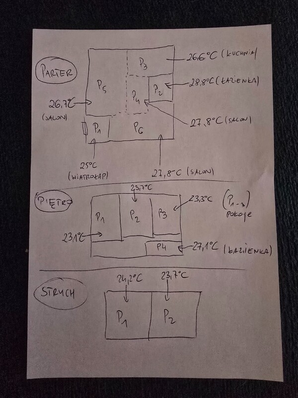 Wstawiam jeszcze orientacyjnie temperatury uzyskane na podlodze. Podlogowka odpalona około 15:00 w związku z czym pomieszczenia na piętrze nie osiągnęły jeszcze zadanej temperatury.