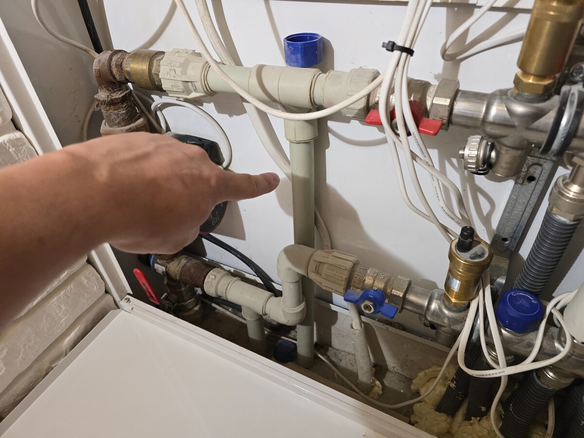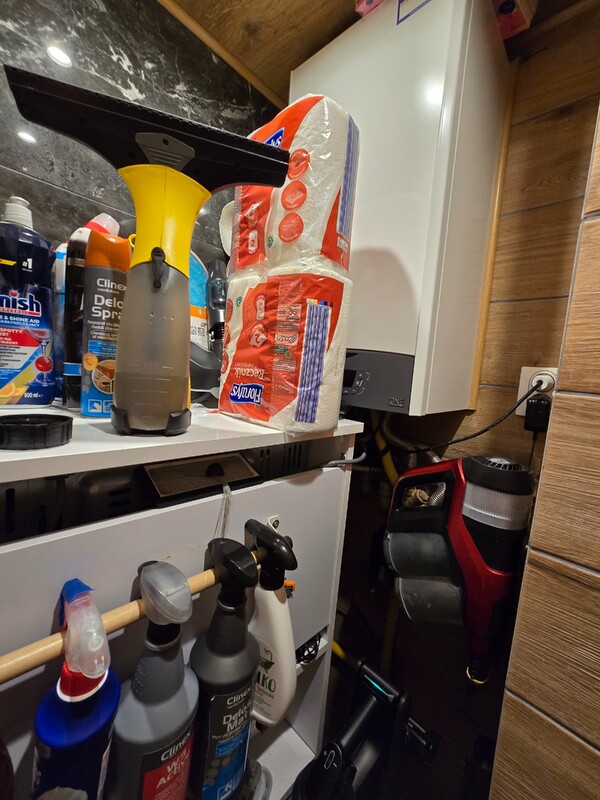 Tu przy samym kotle jest niestety dość ciasno. Wydaje mi się że ta rura oznaczona palcem na zdjęciu jest rozdzieleniem na pierwsze piętro. Mógłbym sprzęgło wsadzić tu na ścianie pod schodami gdzie jest biały kamień i tam wszystko porozdzielac na osobne układy.