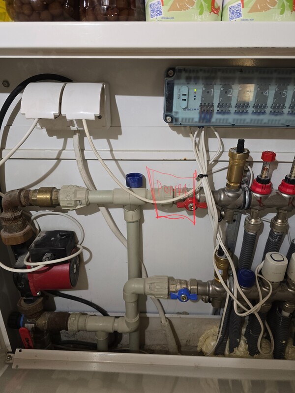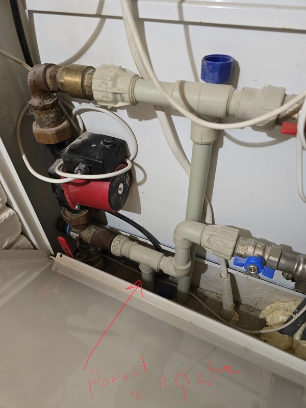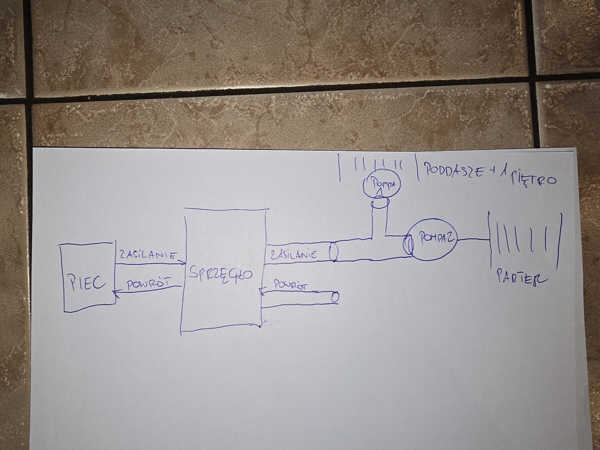 Jeszcze jedna zagwozdka zanim przegadam i zacznę robić z teściem. Bo chyba czegoś nie rozumiem. Czy ty gdzieś nie powinno być powrotu bezpośrednio do pieca? Jest rura zasilająca, do której leci pompa, powrót jest na trojniku, bo zbiera powrót z parteru i pierwszego piętra. Po czym cały powrót jest podłączony mieszaczem znowu do zasilania. Czy nie powinno być gdzieś drugiej rury? Do czego w takim razie bym musiał wpiąć to sprzęgło. Wejście które jest przed pompą, a powrót tam gdzie jest mieszacz? Czy sprzęgło powinno być między tymi strzałkami? Update. Z tego co widzę to strzałka na 1 zdjęciu pokazuje powrót do kotła C.O. jednak dalej mnie zastanawia w takim razie gdzie się schodzi powrót z rozdzielacza z 1 piętra...