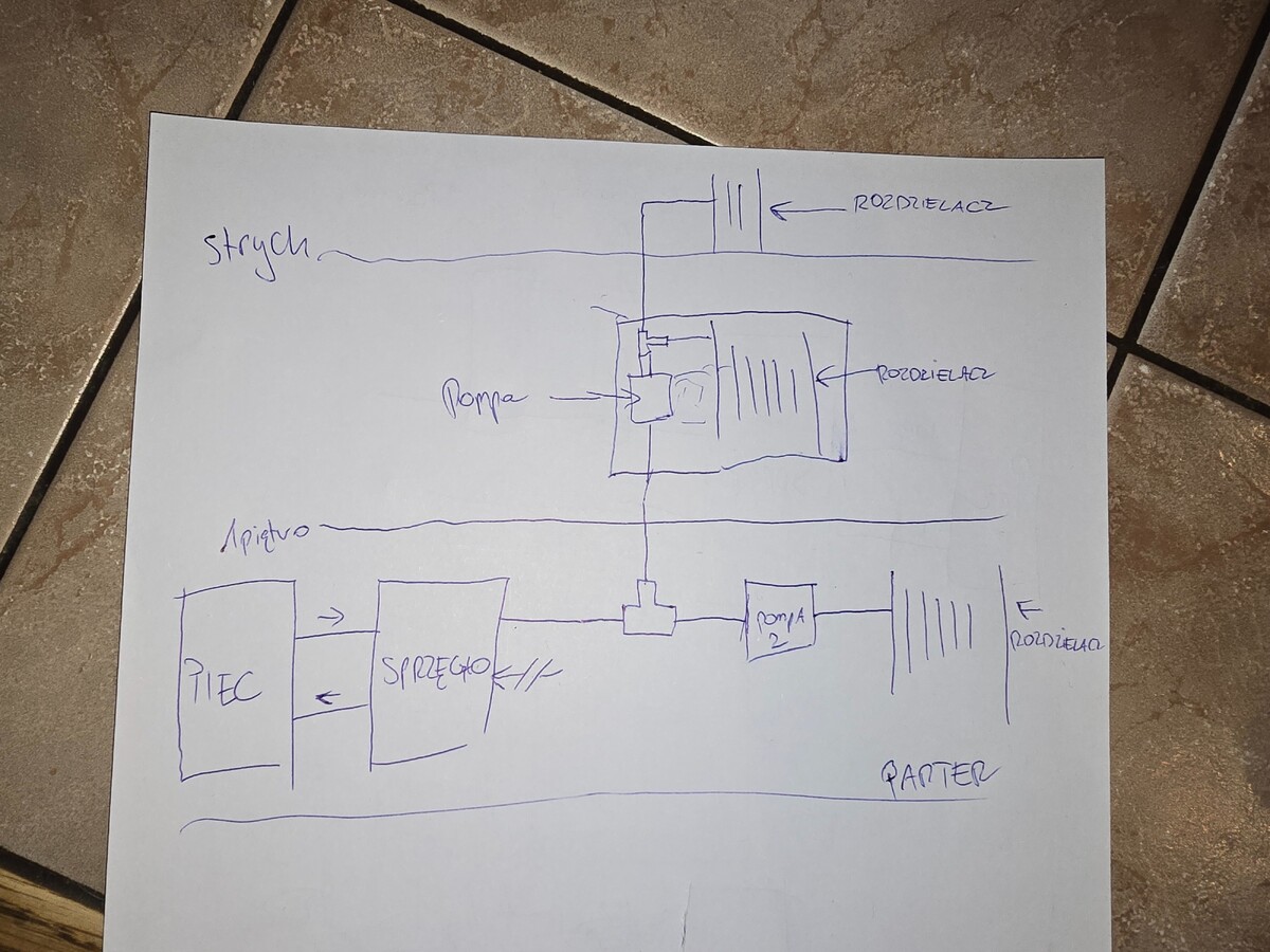 No właśnie to też mam przed oczami. Że jak zostanie na poddaszu przed rozdzielaczem strychowym to 1 piętro będzie niedogrzane tak jak teraz. Jak przeniose pompę z góry na dół zaraz za sprzęgłem, to pompa będzie przed rozdzielaczem strychowym i tym z 1 piętra. Wówczas woda by była pompowana po równo bez "podkradania" ciśnienia rozdzielaczowi z 1 piętra. Podsumowując 1 pompa byłaby na zasilanie parteru a 2 pompa by zasilała 1 piętro i poddasze.