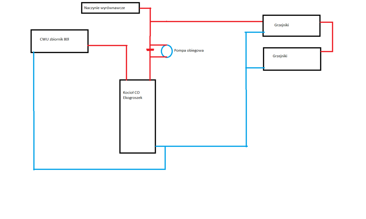 3. Dzień dobry Z racji sytuacji na rynku ekogroszku, szukam alternatywy dla niedawno zamontowanego kotła na ekogroszek. Z racji inwestycji m.in na nowy piec mój budżet jest ograniczony do jakiś 5 tys PLN na alternatywne źródło ciepła, więc pompa ciepła odpada. Fotowoltaiki nie mam, ale w perspektywie kilu lat prawdopodobnie będzie zamontowana. Przeglądając dostępne na rynku rozwiązania, w moim budżecie wydaje się być najsensowniejsze dołożenie do instalacji elektrycznego kotła CO, wstępnie najbardziej mi pasuje Kospel EKCO MN3. Wiem, że ta tym forum jest wielu specjalistów w dziedzinie i bardzo Was proszę o wszelkie porady co zrobić, żeby zimą nie zbankrutować. Jeśli elektryczny kocioł CO, to nie bardzo wiem w którym miejscu najlepiej będzie go wpiąć do instalacji? O ile wyjście z kotła jest ok, jest dużo miejsca, to powrót wychodzi z podłogi i jednym kolankiem wchodzi do kotła, rura calowa zasilanie i powrót. Poniżej kilka parametrów domu i instalacji: Dom wolnostojący parter + piętro + nieogrzewane, nieocieplone poddasze odizolowane Pow. ogrzewana 140m2 Mur: cegła pełna + pustka powietrzna - grubość 50cm Okna: nowe dwuszybowe, 17szt Drzwi wejściowe: Nowe drewniane 1szt Elewacja: Nowy tynk Podłogi parter: Nowe styropian ok. 40cm + wylewka Sufit piętro: płyta GK, styropian 15cm,mata słomiana, strop drewniany grubość ok 50cm Wysokość pomieszczeń 250cm Obecne ogrzewanie: Piec z podajnikiem na ekogroszek klasa 5, zużycie ekogroszku w sezonie 2021-2022:6ton przy temp. pomieszczeń 24stopnie Grzejniki nowe, aluminium, rury nowe alupex do 120 stopni W załączeniu schemat instalacji dla poglądu