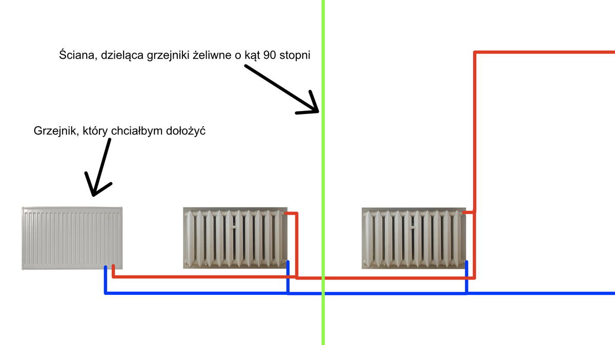 Na powyższej graficie widzicie 2 grzejniki żeliwne oraz jeden panelowy. Żeliwne, to obecne podłączenie w moim pokoju, natomiast chciałbym dołożyć grzejnik w zupełnie innym pokoju. Na logikę powinno działać, ale wolę spytać speców przed zakupem. Nie wiem czy potrzebne jest pokazanie tego, co znajduje się jakby po prawej strony tej instalacji, lecz w razie czego dorysuję. Więc, patrząc od prawej: Rura zasilania wychodzi ze ściany na długość powiedzmy 2 metrów, po czym schodzi w dół do pierwszego grzejnika, następnie biegnie sobie dalej na jakieś 2,5 metra, skręca o 90 stopni w lewo i jest podłączona do drugiego grzejnika. Rura powrotna biegnie przy podłodze na wymiarach analogicznych z powyższymi. Obecnie chciałbym puścić instalację dalej, a konkretnie o 2,5 metra w moim pokoju oraz 2,5 w pokoju za ścianą, tj. o 5 metrów dalej. Grzejnik, który obecnie mam na oku ma przyłącze dolne, zgodnie z grafiką. Grzejniki na grafice (jak i dwa dodatkowe z prawej strony grafiki, których nie widać) biegną sobie na identycznej wysokości i dobrze to działa. Dodatkowy również miałby znajdować się na poziomie tych żeliwnych. Napiszcie mi proszę czy moja logika jest słuszna i czy będzie to działać poprawnie. Zdaje sobie sprawę, że wężownica z pieca kaflowego nie dostarczy dużej mocy do tego panelowego przy spokojnym paleniu, ale zawsze coś tak podletni.