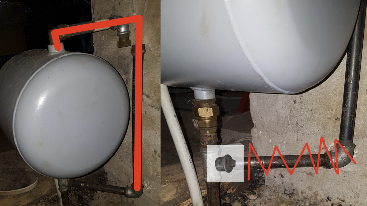 Witajcie Panowie. Posprawdzałem dziś jakie rurki mam kupić oraz jakich długości, a także odkręciłem rurkę od góry zbiornika. Zasadniczo stoi w niej woda, bo działa to na zasadzie poziomicy wodnej i wyrównało się z wysokością poziomu w zbiorniku. Nie wiem czy tak powinno być, bo to wyjście odpowietrzające, ale ogólnie wyjście na górze naczynia nie było zaizolowane, także tamtędy powietrze mogło się wydostawać. Mam zamiar dać rurę na strych zgodnie z poradą kolegi @bercus w ten sposób, aby góra odpowietrznika była poniżej poziomu wody, zgodnie z przedstawionym zdjęciem. Wyprowadzenie tego odpowietrznika jest proste, natomiast chciałbym dobrze zrobić to odpowietrzenie i tutaj proszę o Wasze rady oraz czy w ogóle to ma sens. Otóż obecną rurę (tą, którą widzicie rozkręconą na górze naczynia) chciałbym z powrotem skręcić (dodatkowo uszczelniając jej gwint na górze wyjścia z naczynia), natomiast chciałbym się pozbyć poziomego odcinka na dole i w trójnik pod naczyniem w jej miejsce dać korek. Zakończenie tej rury dałbym w jakąś może szerszą rurę, aby powietrze miało miejsce, gdy całość zabezpieczę wełną przed mrozami i wyglądałoby to w ten sposób: Nie wiem czy dobrze kminię z tą rurą odpowietrzającą, gdyż wyjście tego można zrobić na wiele sposobów i dlatego proszę Was o porady. Mam wszystkie wymiary rur oraz naczynia na strychu. Zasadniczo całość jest na rurach 1/2 i odpowietrznik również będzie na takiej rurze, gdyż taka wychodzi z bojlera. Proszę o komentarze, gdyż chciałbym kupić graty i to złożyć, aby móc rozpalić w piecu jeszcze przed zimą i ewentualnie wprowadzić poprawki, jeśli będzie lipa.