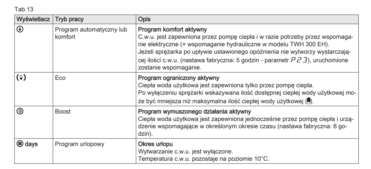 Jedyne co mogę zrobić to włączyć program urlopowy na max 99 dni, wtedy pompa utrzymuje wodę ponad 10*C (w praktyce nigdy nie spadło poniżej więc nie wiem co się wtedy stanie), woda jest grzana hydrauliką tak czy tak bo samo urządzenie nie ma na to wpływu i jest tylko zbiornikiem z wymiennikiem, ale problem polega na tym, że nie wyświetla na wyświetlaczu że woda grzana jest samym wspomaganiem, oraz wydaje mi się, że niepoprawnie określa ilość wody nagrzanej. Co w takim wypadku mam robić? Poniżej wklejam link do instrukcji pompy, z którego też są screeny wyżej: