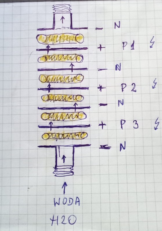 Dwie blachy i Ringo dla psa (jak na zdjęciu), moc można regulować falownikiem lub regulatorem obrotów silnika." N" neutral jest potrzebny do zamknięcia obwodu przepływu prądu , elektronów walencyjnych. Dla bezpieczeństwa trzeba dodatkowo uziemnić rury dopływ i odpływ. Na zdjęciu masz pokazany schemat. Podłączeń. Przy zamkniętym obwodzie elektrycznym nie ma możliwości porażenia prądem. Takie moduły można budować dowolnej wielkości, i kształtu. Do zasilania wystarczy prąd elektryczny 50-60hz o napięciu 60-120v 10-25A (bezpieczne napięcie). Lecz trzeba użyć specjalnego elektrolitu do wody żeby uzyskać odpowiednią rezystancję. Co przekłada się na wydajność i niskie zużycie energii.