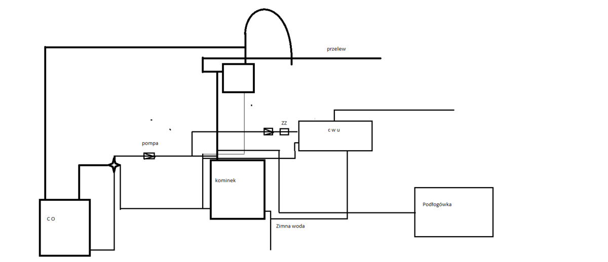 Witam. Jeśli nieodpowiedni dział to z góry przepraszam. Chciałbym prosić o pomoc w ogarnięciu tego bajzlu. Kupiłem dom w którym zamontowany jest piec zasypowy i kominek z płaszczem wodnym, do tego jest bojler 140l poziomy. Wszystko układ otwarty. Po dochodzeniu która rura od czego jest narysowałem schemat. ( Bez zaworów kulowych z filtrem, spustowych, naczynia przeponowego przy bojlerze). Piec jest w piwnicy i jest wpięty do kominka na parterze do tego bojler który jest na strychu. Zastosowane jest ogrzewanie podłogowe ( rozdzielacz z grupą pompowa i mieszaczem). Problem polega na tym, że czy palę w kominku czy w piecu CO to nie grzeje wody w bojlerze. Niby zawór zwrotny jest ciepły a rura którą ma iść ciepła woda jest zimna cały czas. Bardzo proszę kogoś o pomoc jak to poprawić na szybko żeby do wiosny jakoś ogarnąć. Dodam, że podłogę fajnie grzeje i nie ma z nią problemu. Wklejam schemat który udało się mi narysować po rozszyfrowaniu tego wszystkiego. Nie dorysowalem rury powrotu która idzie z podlogowki do kominka
