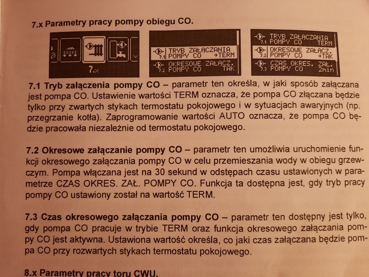 3. Dziękuje za pomoc, zworka została usunięta i piec chodzi tak jak powinien. Regulacja temperatury pokojowej działa poprawnie. Funkcja okresowego załączenie pompy powinna być włączona ? Jakie są wasze porady bądź zalecenia ? Docelowo ustawiony był czas 2 min, zmieniłem na 30 ponieważ strasznie szybko wychładza piec podczas czuwania. Można wyłączyć załączanie okresowe całkowicie albo ustawić na 60 min ?