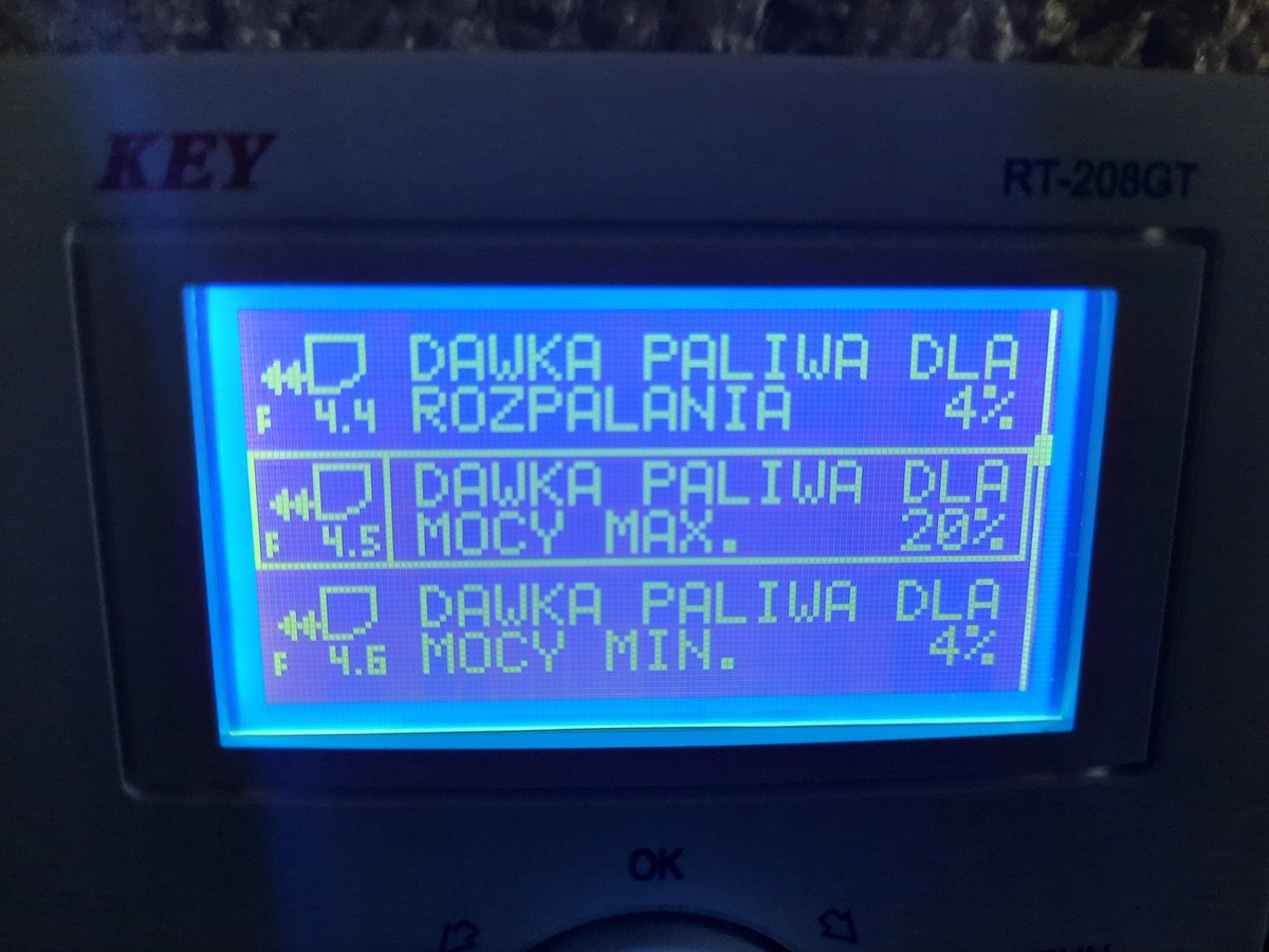 1. Witam Posiadam piec na pellet 24kw wraz ze sterownikiem RK-2006SPGM oraz termostat pokojowy, palnik firmy ElgoMax (brak instrukcji). Piec podgrzewa wodę użytkowa 250l oraz c.o. Zużycie pelletu na dobre wacha się w granicach 35-37kg.Temp pieca ustawiona na 65, wody użytkowej 47. Pellet nie został przeważony, ponieważ nie wiem jaką wartość wpisać w polu 'Dawka paliwa moc max'. Dom budowany 2003/4, ocieplony, powierzchnia użytkowa 280m2. Czy to jest normalne spalanie ? Temp jaka mamy ustawioną całą dobę to 18.5 powyżej tej temp piec spala w granicach 45/24. Pellet firmy Olczyk. Wrzuca ustawienia pieca do weryfikacji ustawień. Dziękuje