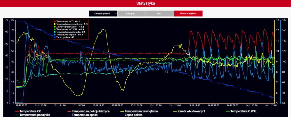 Cześć, Przyszedłem po pomoc na forum bo nie mogę sobie poradzić ze spalaniem węgla. Mam kocioł Sas Sold 14kW i od nowości jadę na sterowaniu PID. To mój trzeci sezon. Zawsze było ok - dopalał do drobnego popiołu, zostawało trochę rozpadających się spieków. Ostatnio jednak z uwagi na braki w węglu kupiłem węgiel słabszy kalorycznie niż zawsze do tej pory używałem. Do tej pory to były węgle około 28-29Mj, ten ma max 24Mj. Załączyłem piec po dłużeszj przerwie i mam stosunkowo wysokie spalanie jak na taką pogodę (około +5 stopni). Leci około 21kg węgla na dobę. W czasie środka zimy mając niedocieplony dom spalałem około 35kg gdzie było minus 15-20 w nocy. Teraz dom jest docieplony i temperatury zewnętrzne też lepsze. Załączam zdjęcie popielnika. Węgiel jest nadpalony, jak go przełamię to w środku jest czarny. Wyczytałem na forum, że trzeba w takim przypadku zwiększyć przerwę między podaniami paliwa ale widzę, że na tym sterowniku nie ma za bardzo opcji do sterowania (chyba, że go wyłączę - sterownie bez PID czego nie chcę robić). Do tej pory zmieniłem : granulację paliwa z drobnej na grubszą. Bez zmian Zmieniłem temperaturę samego kotła z 45 na 60 stopni, a mniejsze pozostawiłem na CWU 45 stopni, 43 stopnie na zawór 4D grzejnikowy, ochrona powrotu włączona w "PID Nadzór" zmieniłem podawanie z 5 na 7 minut. Czekam do jutra czy coś to zmieni. Dołączam też wykres z ostatnich 4 dni z palenia jeśli to coś pomoże w ocenie sytuacji.