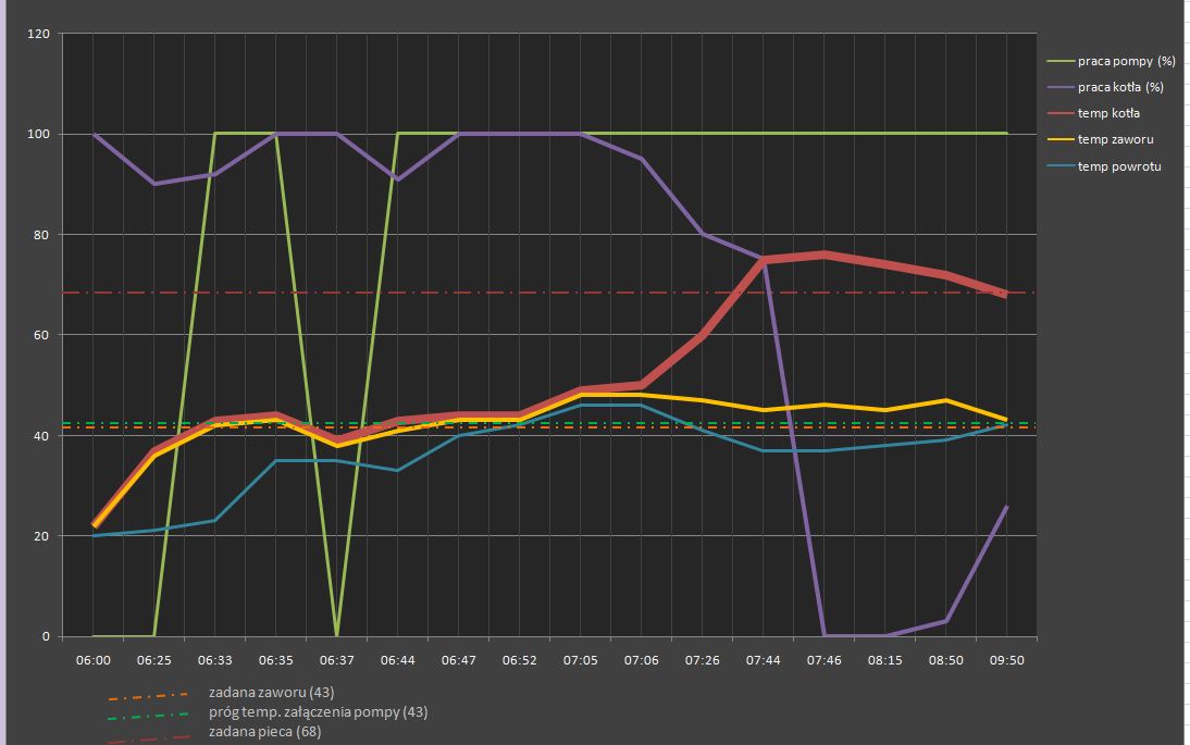 Dobra, dzisiaj dla pewności i jasności odpaliłem wystudzony piec na zimnej instalacji (wczoraj cały dzień wygaszone). Niestety sterownik nie ma opcji tworzenia wykresów, więc to co widać poniżej to moja robota na podstawie ręcznego odczytu. Proszę zwrócić uwagę na to że oś czasu nie jest liniowa, interwały nie są równe. Dla ułatwienia interpretacji: zimny piec rozpala się powoli, przez pierwsze pół godziny temperatura rośnie. Po ok pół godziny temp. na zaworze osiąga próg załączenia pompy CO (na wykresie 6:33, kocioł i zawór 43*C, powrót 23*C). Pompa puszcza na kaloryfery. Zima woda z instalacji ochładza kocioł i zawór w ciągu 2-3 minut do temp ok 38*C i pompa się znów wyłącza (ale powrót się nieco wyrównuje z piecem). Potem powrót jeszcze nieco spada, ale układ znów się nagrzewa. Bardzo powoli, przez kolejne pół godziny powrót "dogania" temperaturę kotła i dopiero kiedy są one zbliżone (7:06, kocioł/zawór/powrót = 50/48/46*C). Potem piec nadal stopniowo się rozgrzewa (na wykresie przyspiesza, ale przypominam że to nie jest liniowa oś czasu), ale z jakiegoś powodu powrót znów się wychładza (prawdopodobnie z powodu przymknięcia zaworu 3d po osiągnięciu zadanej temperatury). Później już nie mogłem tak często zaglądać bo byłem w pracy (co prawda w domu, ale jednak). Powrót w każdym razie oscyluje w okolicach 38-42 stopni kiedy układ jest już nagrzany. Piec pracuje w przedziale ok 60-75*C (mogę mu tylko zadać temperaturę, w sterowniku nie ma żadnej histerezy samego kotła). Spadek temperatury powrotu przy załączeniu pompy CO jak widać zaburza cykl. Obecnie nie potrzebuję grzać 24/dobę, więc dobrze by było żebym mógł pompę zatrzymać, ale jak to zrobię, to przy ponownym włączeniu znów nastąpi wyziębienie pieca. Stąd też myślę o tym żeby załączać pompę cyrkulacji żeby właśnie chronić się przed takimi spadkami. Sądzę w tej sytuacji że przepięcie pompy CWU na pompę cyrkulacji i wstawienie jej na powrót, a przed nią zawór termostatyczny mieszający zasilanie z powrotem będzie chyba najlepszym rozwiązaniem z największym kompromisem między solidnością rozwiązania a budżetem. Proszę mnie poprawić jeśli się mylę, ale to zdaje się jest propozycja kogoś kto już się tu udzielał. ======= Co do bezpieczeństwa instalacji, nie zwróciłem uwagi. Na piecu jest trzecie wyjście z zaworem bezpieczeństwa CW617N 2bar z afriso, zatem jest ochrona przed wzrostem ciśnienia. Jedyny szkopuł z nim jest taki, że jest po prostu wkręcony w wyjscie pieca i w razie otwarcia będzie rzygał na podłogę piwnicy/osobę stojącą obok. Pytanie tylko czy lepiej teraz wpiąć to wyjście bezpośrednio w pion grzewczy, czy np jako spust do kanalizacji?