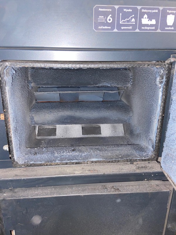 2. Tworzą się dość duże spieki sklejonego trochę niedopalonego węgla oraz powstaje sporo biało-czarnego nalotu w komorze spalania.