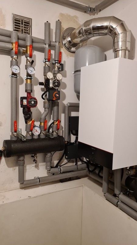 Witam, Chciałbym się przede wszystkim przywitać bo jestem nowy na forum 🙂 Mam takie pytania: Od kilkunastu dni zacząłem grzać gazem w domu w którym aktualnie nie mieszkam. Piec VIESMANN VITODENS 100, 25 KW jednofunkcyjny (ten model z 2021r.) + zbiornik 100L , Dwa obiegi , podłogówka + kaloryfery + czujnik pogodowy. + dodatkowo jakieś 2 sterowniki Viessmann widoczne na jednym ze zdjęć. Wydaje mi się, że mimo wszystko piec pobiera za dużo gazu. Ustawiając w ViCare temp. 12 stopni (pomieszczenia z podłogówką) + 10 stopni (pomieszczenia z grzejnikami), pobiera średnio 7,2 m gazu, a piec pracuje 24h na dobę non stop na modulacji 8%. Temp na zasilaniu w granicach 32 stopni. Do tego obydwie pompy chodzą także bez przerwy na III biegu. To też mi się wydaje dziwne, bo jedna ciągnie 90W a druga 22W. Czy piec powinien chodzić bez przerwy? Czy na modulacji 8% czyli rozumiem, że tylko 2KW , zużycie gazu jest normalne? Teoretycznie piec ma modulację od 3,2-25KW , to dlaczego schodzi aż do 2KW. Czy ja coś może źle rozumiem. Sorry, ale jestem zielony w temacie , zaczynam dopiero się tym interesować i chciałbym żeby pomału wszystko było ustawione jak należy. A może jest ktoś z okolic Andrychowa na forum co ma ten sam piec, podobną instalację, co by pomógł w ustawieniach? Byłbym bardzo wdzięczny!