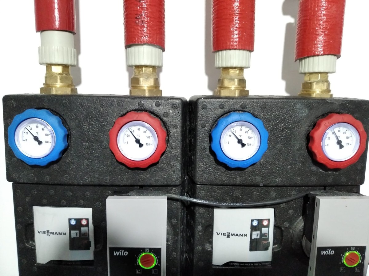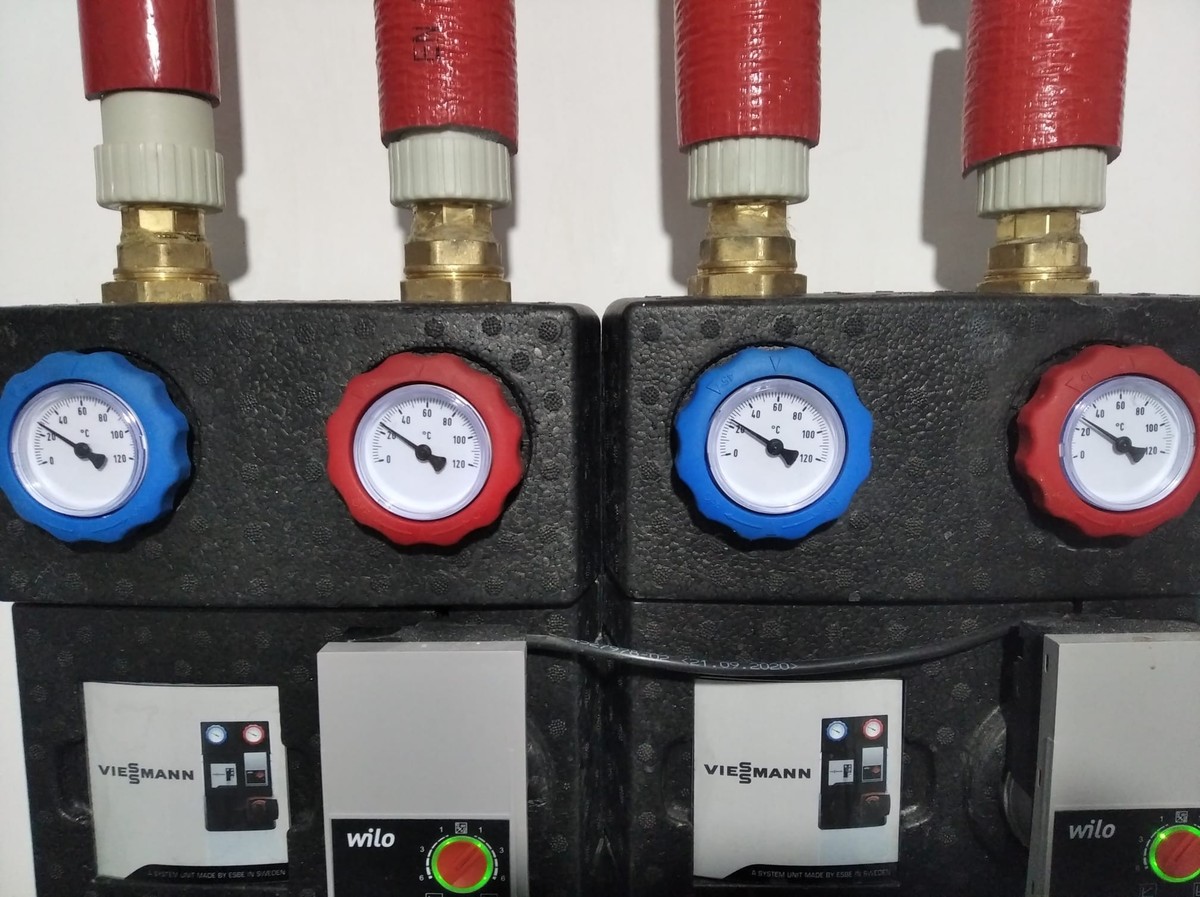 ogrzewanie podłogowege, dwa obiegi grzewcze parter 130 m² piętro 60 m², sprzęgło, mieszacz, grupy pompowe