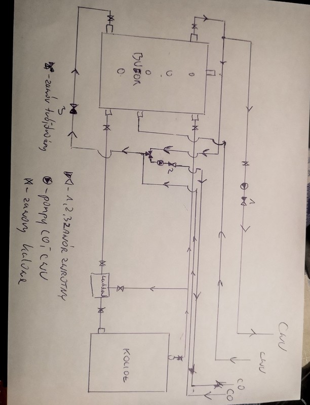 Kocioł stalmark eko wood 21 kw. Bufor 1000l. Laddomat wkładka 78 st C. Zawory zwrotne grzybkowe za pompą CO i CWU oraz na powrocie CO przy buforze. Nie zaznaczyłem odpowietrzników, i naczynia wyrównawczego . Oczywiście są na buforze, na rurach zasilajcych i powrotnych Co i cwu. Układ otwarty. Na kotle zawór bezpieczeństwa chyba 6bar. Dom stary słabo izolowany więc temperatura na grzejniki musi być wysoka.. Poprzedni kocioł 9kw. -