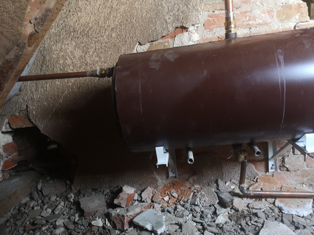 Zanim mnie opieprzycie to mam jeszcze jedno pytanie. Mam zbiornik 80 l ok. 50 cm na buforem czyli najwyższym punktem instalacji CO. Niestety ten zbiornik jest połączony do zasilania rurą miedź fi 22. Przy temp. ok 76-80 st C słychać bulgotanie w kotle.Czyli gdzieś zbiera się powietrze. Na chwilę pomaga dolanie wody. Czy coś pomoże podniesienie zbiornika wyrównawczego o ok. 50 cm? Zbiornik jest równo tylko fotka krzywo wyszła 🤔
