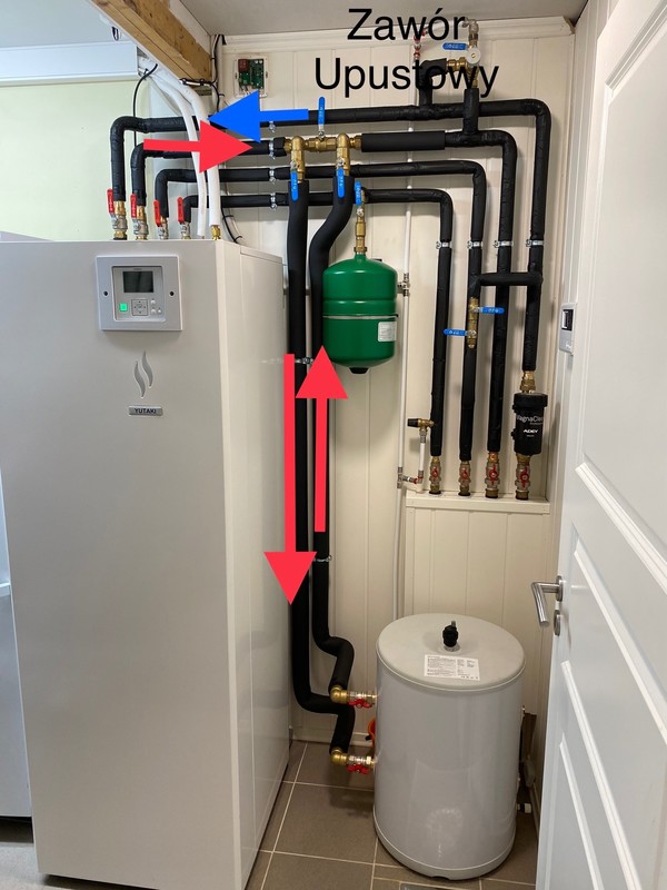 Bufor przeniesiony na powrót z poprawnie podłączonymi wyjściami na ukos @Witek-z-Ulicy😀. Temperatura na wyjściu PC stała 35 stopni. Ostatnio nie jest za zimno między 0 a -3 . Jest znaczna różnica podczas defrostu praktycznie grzałki się nie załączają przy starcie pompy. Zmieniłem jeszcze sposób sterowania z PC . Wcześniej sterowaniem włącz wyłącz sterowała centralka od inteligentnego domu w ten sposób iż jeśli jedna pętla podłogówki się otwierała to PC otrzymywała sygnał na start obiegu grzania . Teraz mam ustawione na termo wyłączanie i gdy osiągnie max temp 38 stopni na buforze to przechodzi w stan spoczynku i raz na jakiś czas włączy się aby dogrzać bufor. Teraz przy otwartej pętli leci cieplejsza podgrzana woda przez PC i gdy spadnie do 34 stopni pompa włącza się z automatu. i te pare minut co potrzebuje na start dostaje z bufora lekko cieplejszy czynnik a przez to nie zapina grzałek.