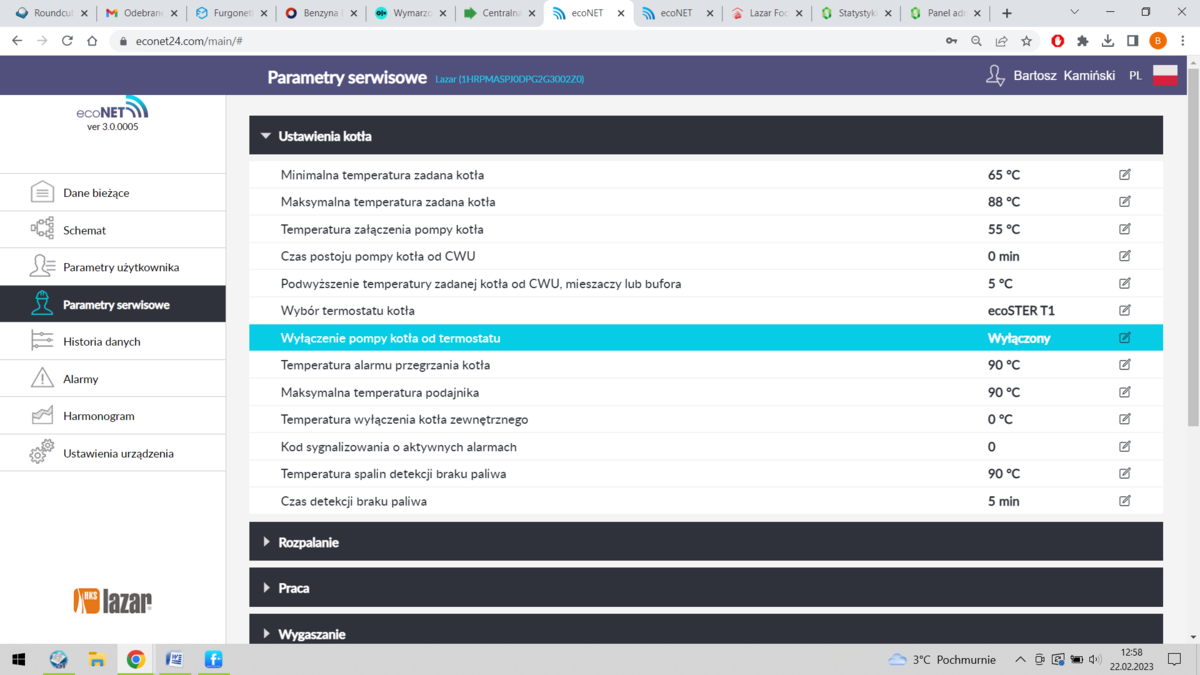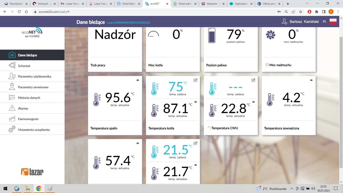 Witam zasypany zasobnik Barlinek, spaliłem go następnie Zasypałem LAVA spaliłem. Cały czas miałem temp kotła- 54-56 temp spada poniżej 55 i nie daje na kaloryfer. Dopiero jak osiągnie temperaturę w pokoju i przejdzie w nadzór to temp kotła rośnie do 80*C. Cały czas podczas pracy 100% kotła mam temp spalin 130-140*c a w kotle 55. Piec chodził dobrze a od 2 miesięcy widzę że nic mu nie pomaga. Proszę o pomoc, sugerując się sceenami w/w. W tej chwili nagrzał wodę w boilerze przy temp. kotła 70. Później zaczął grzać kaloryfery. Spadło do 53,9 i tak będzie się bujał z 2 godziny aż dobije do maks 57 stopni i przejdzie w nadzór bo nagrzeje do temp pokojowej zadanej. Przejdzie w nadzór i temp kotła wzrośnie z 57 do 80 i powoli będzie spadać... -