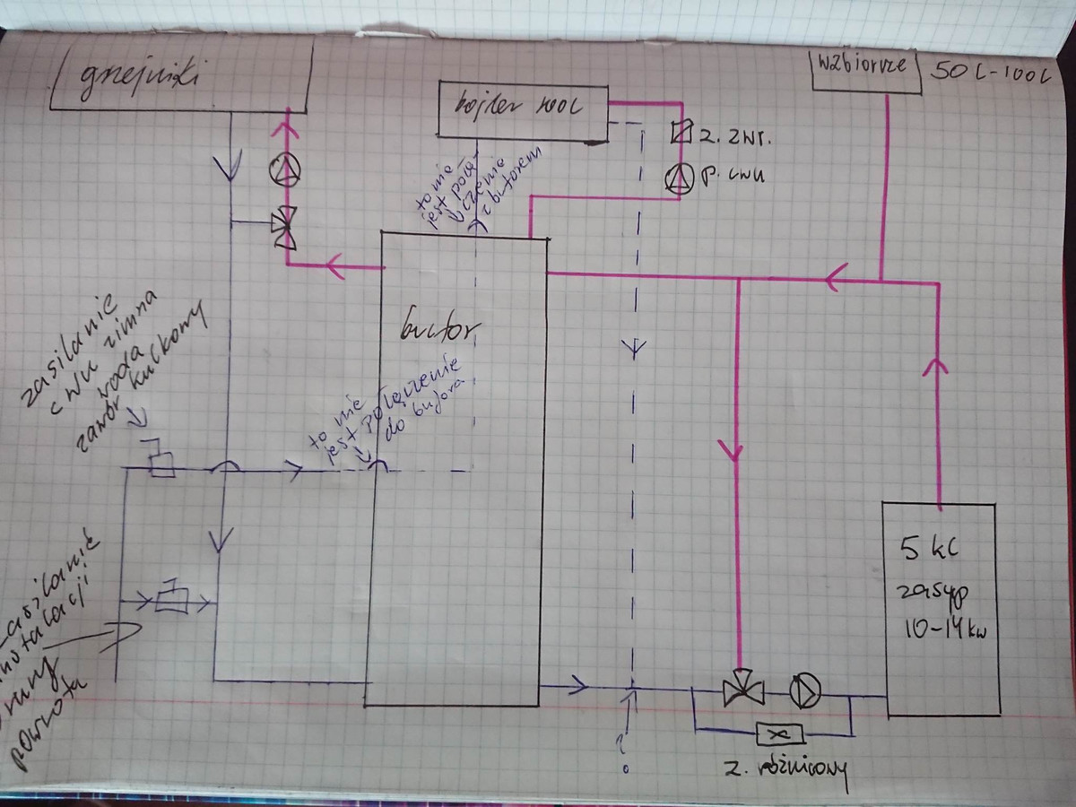 2. Witam, w tym roku czeka mnie wymiana kopciucha i zdecydowałam się na instalacje Ogniwo / MPM DS (10-14kw się zobaczy) + bufor (800 lub 1000l) Dodam w załączniku schemat, który rozrysowałam. Gdybyście mogli spojrzeć bardziej doświadczonym okiem i dać znać czy jakoś się to klei, byłoby mi bardzo miło 🙂 Mam kilka pytań: 1) Czy powrót z bojlera cwu może być wpięty do rury powrotu do kotła czy jednak musi przechodzić bezpośrednio przez bufor? 2) Zawór zwrotny za pompą przy piecu - czy umieszczać, jeśli tak to w którym miejscu? Chcę też zrobić obejście z zaworem różnicowym na grawitację w razie braku prądu (zdarza się niestety), czy prawidłowo je umiejscowiłam? 3) Zasilanie instalacji - aktualnie jest wpięte do rury powrotu z grzejników, czy mogę to samo zastosować do nowej instalacji czy ma iść bezpośrednio do bufora czy nie ma to znaczenia? 4) Jakich polecanie producentów pomp CO,CWu i zaworów 3drożnych? 5) Jeśli gdzieś czegoś brakuje, jakiegoś zaworu, odpowietrznika, dajcie znać. Ja sie dopiero uczę 🙂
