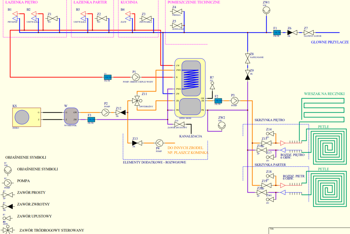 Instalacja do domu dwukondygnacyjnego. Ogrzewanie w pełni podłogowe (niskotemperaturowe), z jedną grzejniko-suszarką w łazience na piętrze.