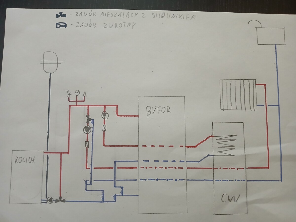 Witam. Co tu jest źle? Jak ładuje bufor gorąca woda idzie w wężownice do CWU i do podmieszania na trójdrożny który idzie na grzejniki przez co bufor nagrzewa się się od góry i od dołu i nie ma zimnego powrotu. Układ otwarty. Naczynie wzbiorcze może zostać na pionie od grzejników czy lepiej go wpiąć gdzieś indziej. Za pomoc z góry dziękuję. Pozdrawiam