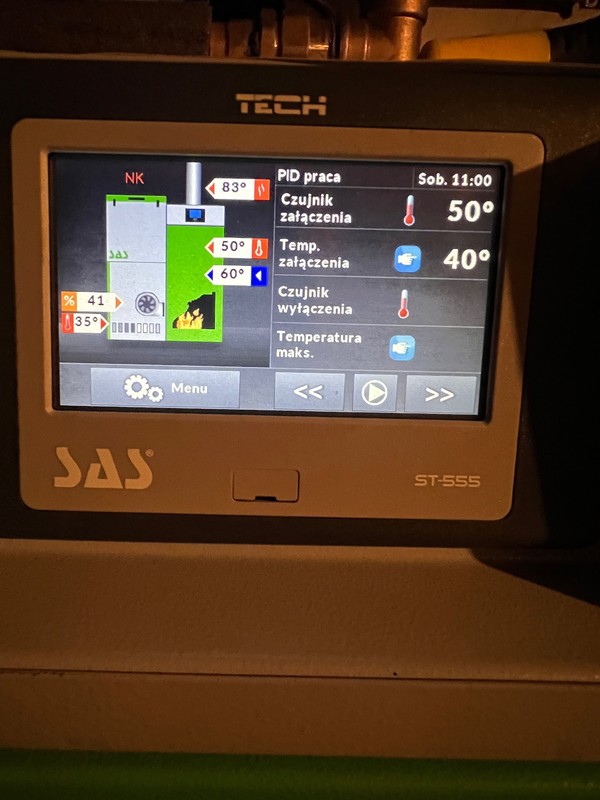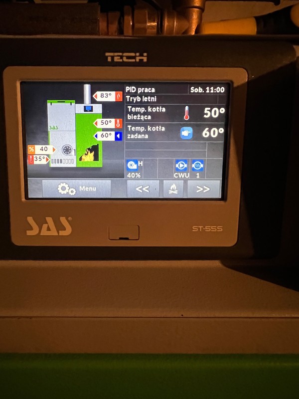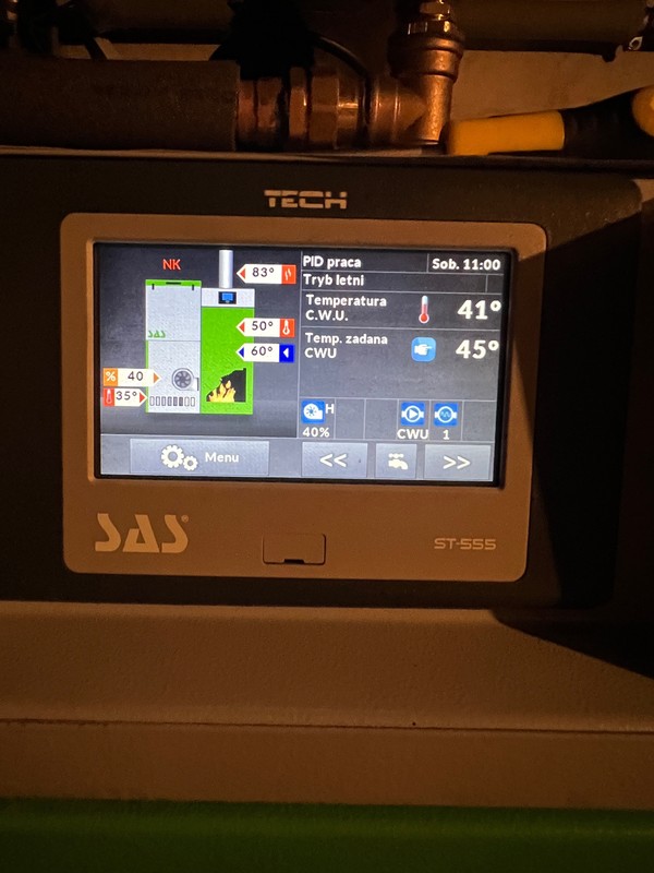 Dobór mocy kotła co SAS Efekt 14kW, zbyt mały ?engance odpowiedział(a) na engance temat w Kotły z podajnikiem Spróbuje go ustrzelić kiedy będzie w trybie pracy. Wczoraj kiedy go testowaliśmy na CWU i CO, jeśli dobrze pamietam było koło 110’. 2/3h temu zmieniłem podawanie na 1s, poniżej efekty.Wielkiej zmiany chyba nie ma, sprawdzę jutro rano. co do czujników, na pewno zauważyłem czujnik na powrocie, temperatura spalin, jeden idzie do bojlera pod płaszcz, i pogodówka Edit: trafiłem go podczas pracy, temperatura na wylocie 80/83 stopnie zdjęcia ze sterownika poniżej