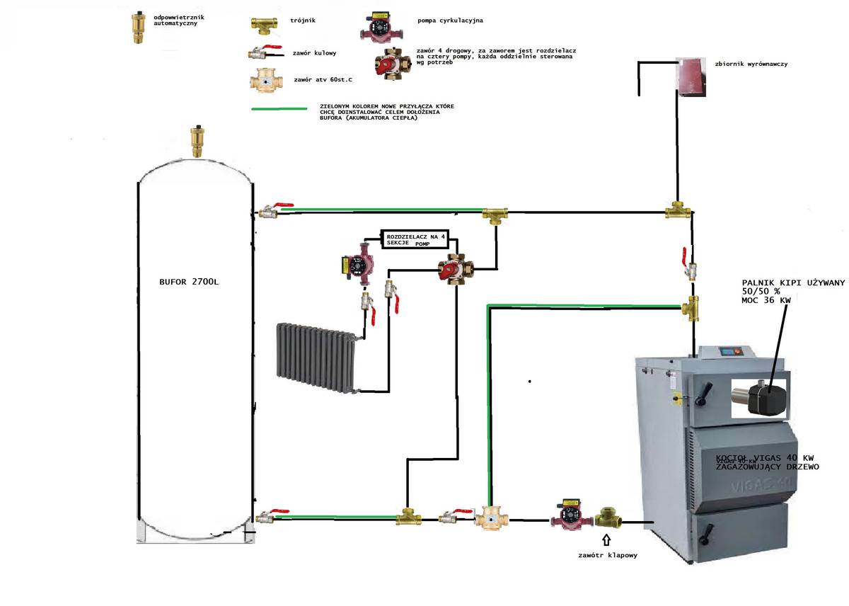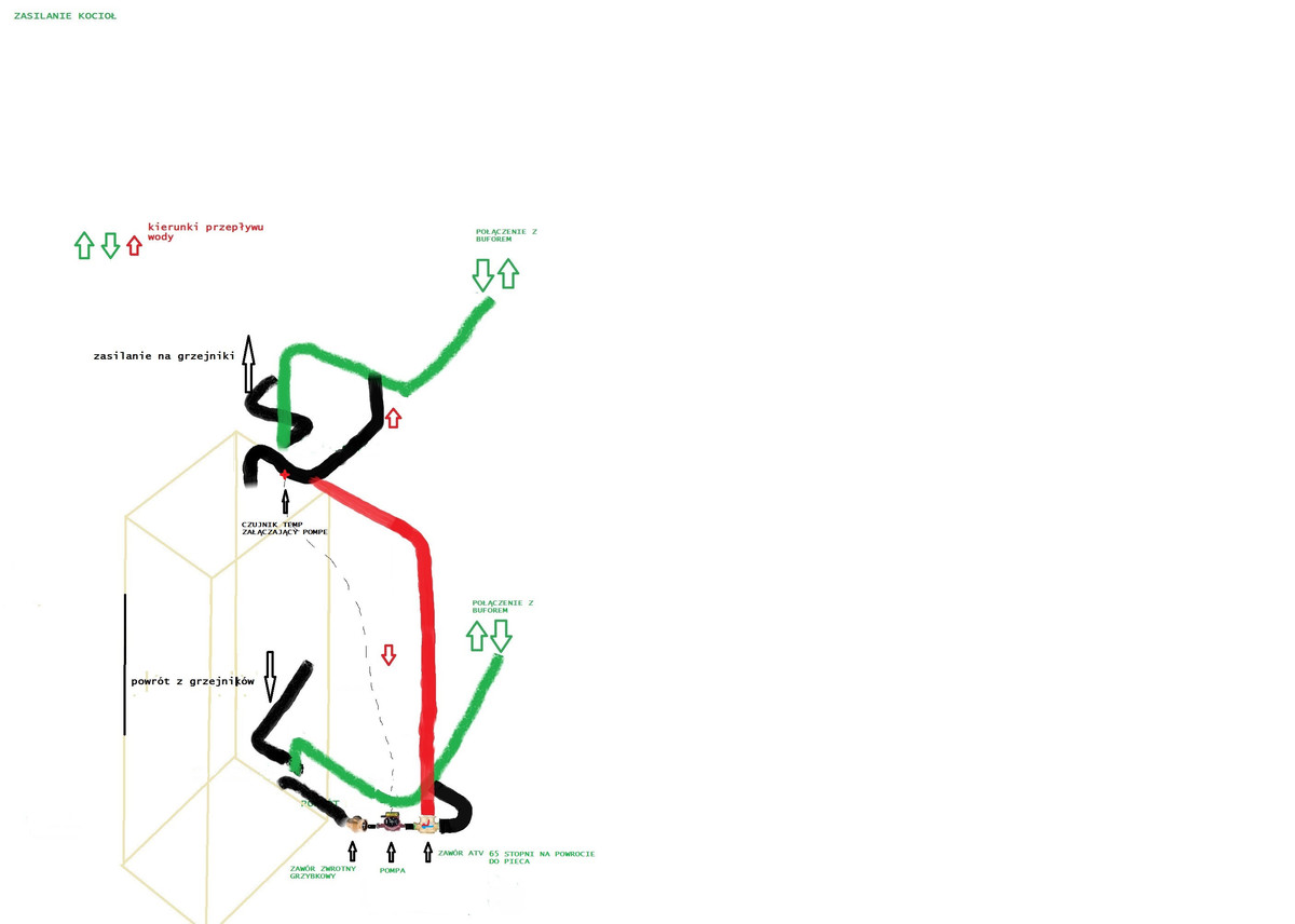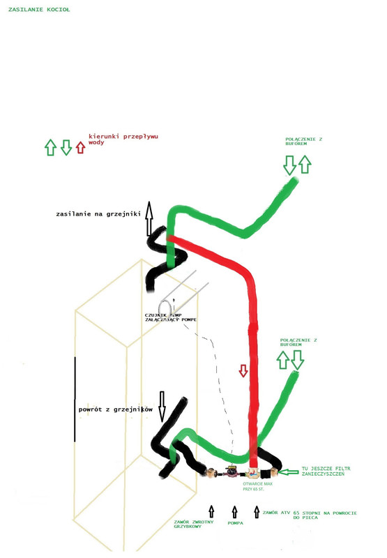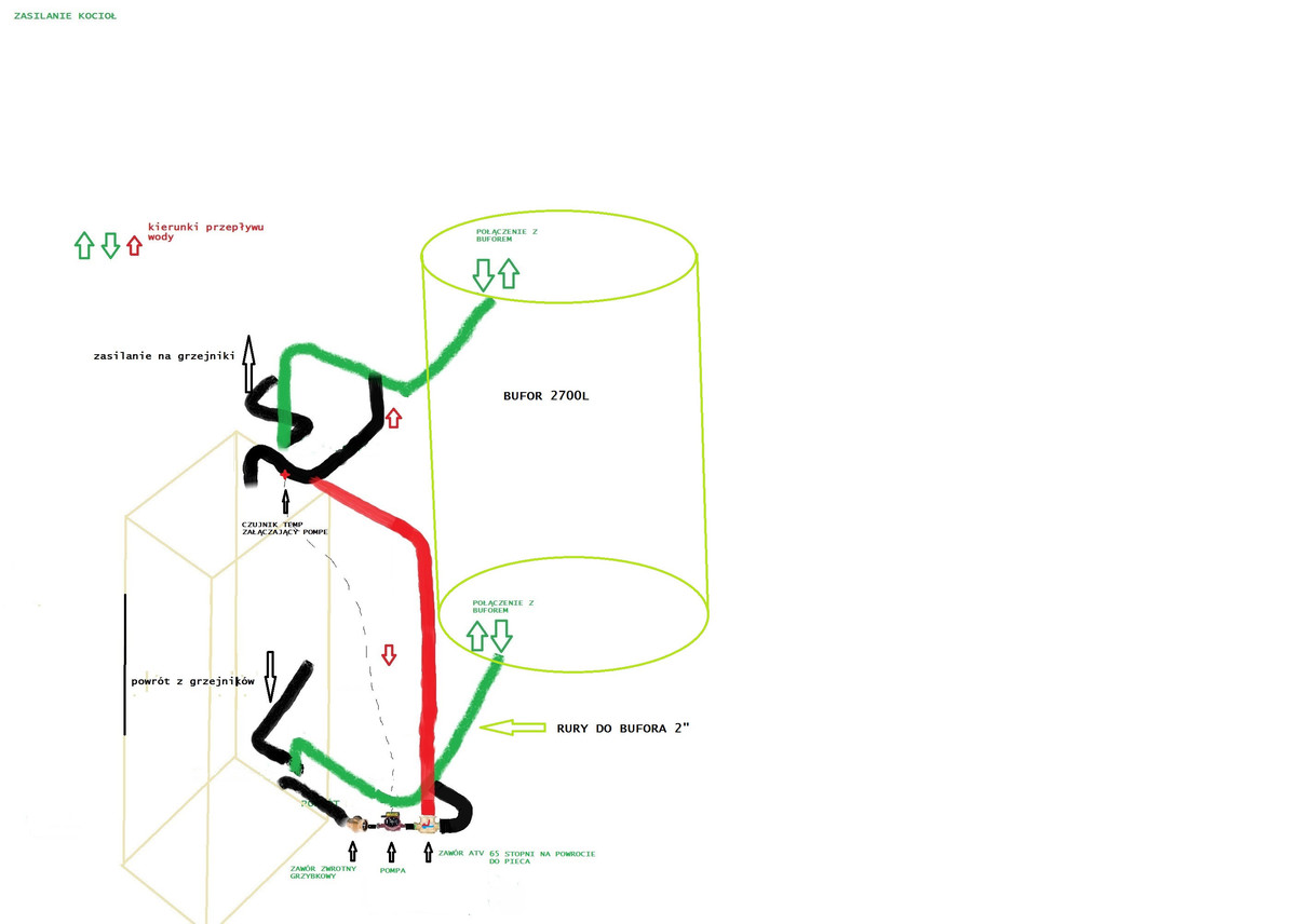dobraNarysowałem dla siebie jak mam połączyć realnie, więc wrzuciłem. Na tą chwile zawór 4d pilnuje mi temp powrotu na kocioł 60 stopni i działą dobrze. jak zrobię dodatkowy obieg samego pieca z ATV to zawór 4d będzie musiał zostać bo jest wszystko wkoło niego nie do zmiany , kolektor jest 6 cali i reszta przyłączy 2" rury spawane . Ale to nie problem bo jego wysteruję, abo całkiem otworze na stałe , bez znaczenia. Bufor będzie bezpośrednio jak i piec połączony z wyrównawczym naczyniem jak się nie mylę 200l na strychu 3cie piętro.