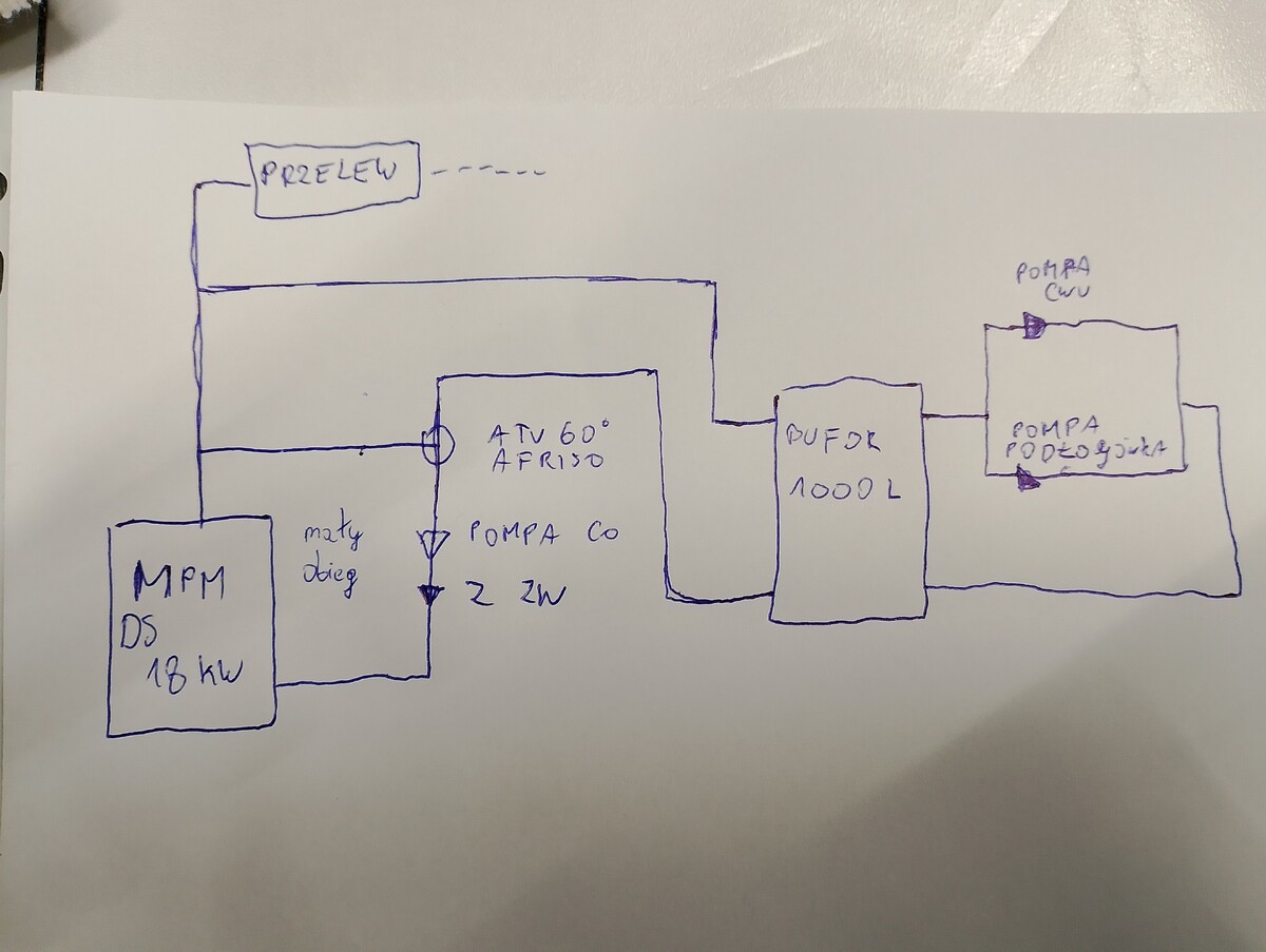 Witam. W załączniku uproszczony schemat. Instalacja pół roku działała sprawnie, ostatnimi czasy zagotował mi sie kocioł, od tego momentu zaczęło mieszać wodę w buforze, wymieniona została pompa co i zawór zwrotny, lecz problem nie zniknął. Ja już tracę zmysły, pół roku wszystko chulało pięknie a tu teraz takie cyrki mimo wymiany zaworu i pompy. Myślę o dołożeniu zaworów zwrotnych ale gdzie ? A może coś ze zaworem ATV? Może ktoś coś podpowie