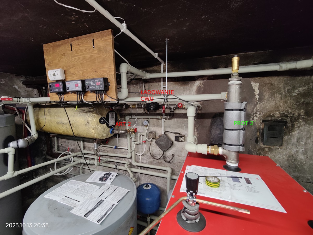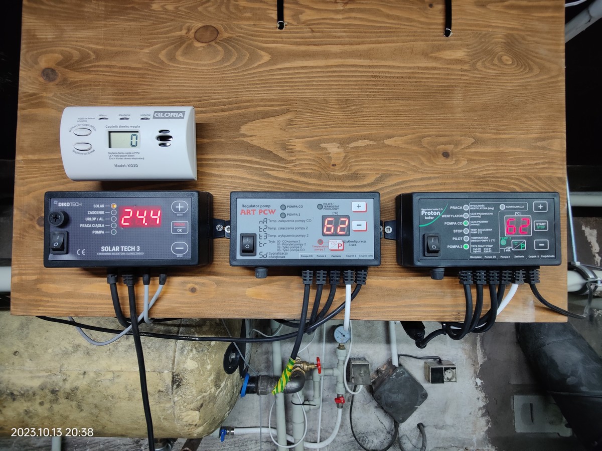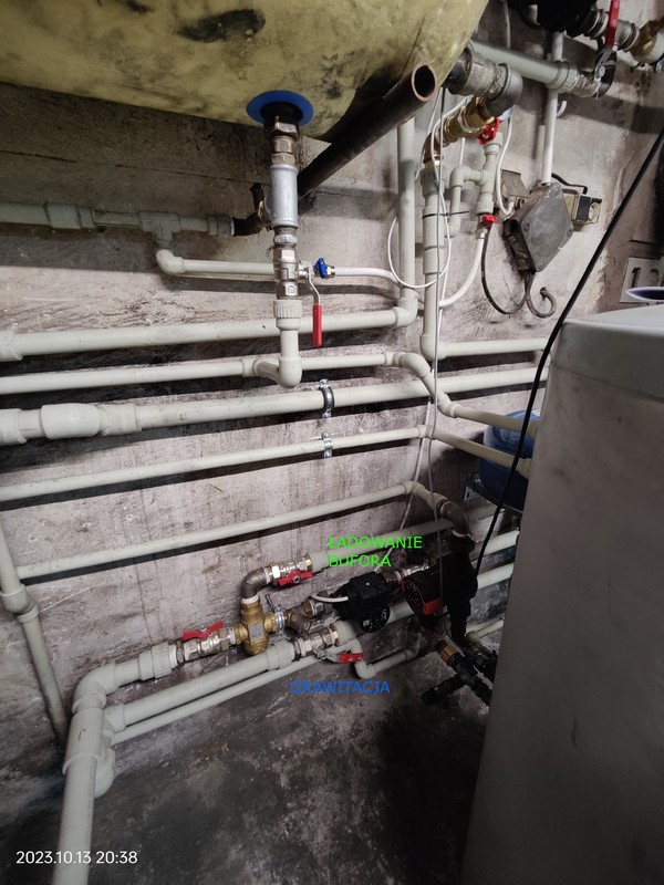 Cześć wszystkim, właśnie w swoim domu zakończyliśmy montaż kotła na drewno Konstal/ Sekom KDS+ 20kW oraz 2 buforów po 420 L. Do tego sterowniki - Proton Bufor do ładowania buforów + obsługi CO oraz ART PCW do obsługi CWU. Do instalacji podłączone są solary, ale one nie są jakoś bardzo istotne w tym momencie. Po kilku paleniach wygląda na to, że wszystko działa tak jak powinno, ale są wątpliwości dotyczące tego, czy sterowniki są dobrze podłączone (czujniki w dobrych miejscach), czy może w ogóle są nietrafione i trzeba zainwestować w coś innego? Zacznijmy od CWU- obsługuje je sterownik ART PCW. Czujnik zamocowany na rurze zasilającej bufor. Podczas rozpalania otwarta jest grawitacja, wtedy zasilanie bufora szybko się nagrzewa. Załączenie pompy ładującej CWU ustawione chyba na 50 stopni. Histereza 5 stopni. Temperatura zadana 48 stopni. Zasilanie CWU realizowane w dwojaki sposób- albo bezpośrednio z kotła, albo po wygaszeniu kotła i otwarciu zaworu może być realizowane z buforu. Dlatego czujnik właśnie w tym miejscu. Gdyby był na kotle to po jego wygaszeniu nie ładowałby CWU. Tutaj raczej nie mam zastrzeżeń, działa to całkiem ok. Ale wszelkie sugestie mile widziane. Teraz zasilanie buforu - sterownik Proton Bufor. Czujnik ładowania buforu (POMPA 2 na sterowniku) umieszczony na kotle. Temperatura załączenia ładowania 55 stopni. Po załączeniu bufor ładuje się jednocześnie z zasilaniem CWU. I teraz zagwozdka - w sterowniku już serwisowo jest ustawione, że temperatura kotła musi być 3 stopnie wyższa od temperatury bufora, aby pompa ładująca (POMPA 2) działała. Już przy zrównaniu temperatur na górze bufora (bo tam w kapilarze jest czujnik) i kotle pompa wyłącza się. Mamy teraz sytuację, że na górze bufora mamy np. 70, w środku 50, dół 35 - a pompa zrobiła stop. Czy tak powinno być ? W sterowniku są tylko 2 czujniki- na kocioł i do bufora. Dodatkowo z czujnika bufora załącza się pompa C0 - przy 43 stopniach na górze zaczyna pompować na grzejniki. Na mieszaczu ustawione około 42-43 stopnie na instalację. Tutaj również serwisowo ustawiona histereza 5 stopni- pompa CO wyłączy się, gdy na górze bufora jest 38 stopni- teoretycznie są już zimne. Zauważyłem też, że przy takiej konfiguracji - na kotle 55 stopni- odpala się pompa bufora. Na zasilaniu (czujnik CWU) temperatura powinna rosnąć, a tymczasem spada. Dlaczego ? W tym samym czasie podczas rozpalania co jakiś czas załącza się pompa CWU jeśli na zasilaniu bufora pojawi się 50 stopni. Stan taki po jakiejś chwili się stabilizuje, kocioł ładnie ciągnie w górę, pompa CWU praktycznie ładuje cały czas do osiągnięcia temp zadanej, pompa bufora ładuje, pompa CO również zasila grzejniki po pojawieniu się ciepłej wody na górze bufora. Mam trochę wątpliwości czy dobrze jest rozwiązane podłączenie zarówno CO, jak i bufora pod jeden sterownik i w zasadzie 1 czujnik na górze bufora. Jestem też laikiem w temacie buforów i niepokoi mnie czy bufor dalej się nagrzewa do dołu mimo sytuacji, że na kotle i górze bufora mamy identyczną temperaturę i pompa ładująca zrobiła stop ? W tym samym czasie CO grzeje dom i wyciąga wodę z góry. Muszę też trochę posiedzieć przy samym kotle i ogarnąć ustawienia wszystkich klapek powietrza wtórnego i przesłon w drzwiczkach bo to też czarna magia... Trochę się rozpisałem 😉 Dorzucam zdjęcia.