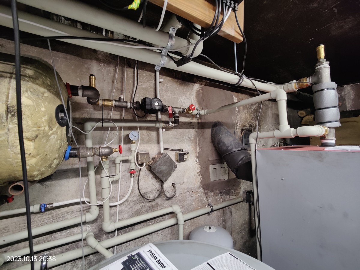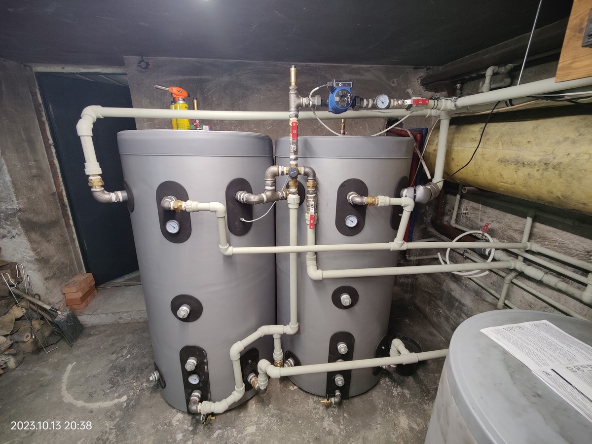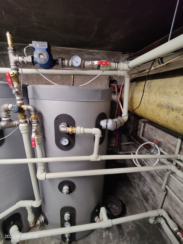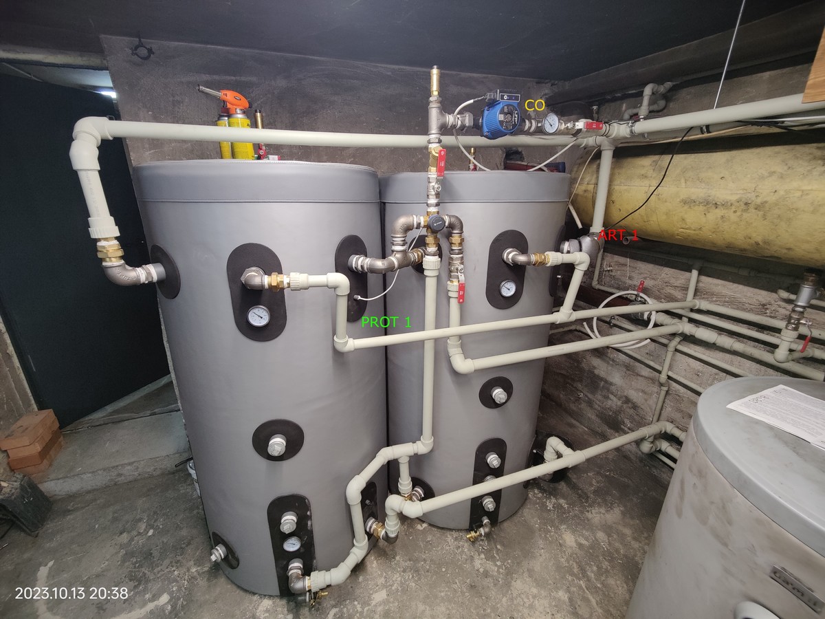 Cześć wszystkim, właśnie w swoim domu zakończyliśmy montaż kotła na drewno Konstal/ Sekom KDS+ 20kW oraz 2 buforów po 420 L. Do tego sterowniki - Proton Bufor do ładowania buforów + obsługi CO oraz ART PCW do obsługi CWU. Do instalacji podłączone są solary, ale one nie są jakoś bardzo istotne w tym momencie. Po kilku paleniach wygląda na to, że wszystko działa tak jak powinno, ale są wątpliwości dotyczące tego, czy sterowniki są dobrze podłączone (czujniki w dobrych miejscach), czy może w ogóle są nietrafione i trzeba zainwestować w coś innego? Zacznijmy od CWU- obsługuje je sterownik ART PCW. Czujnik zamocowany na rurze zasilającej bufor. Podczas rozpalania otwarta jest grawitacja, wtedy zasilanie bufora szybko się nagrzewa. Załączenie pompy ładującej CWU ustawione chyba na 50 stopni. Histereza 5 stopni. Temperatura zadana 48 stopni. Zasilanie CWU realizowane w dwojaki sposób- albo bezpośrednio z kotła, albo po wygaszeniu kotła i otwarciu zaworu może być realizowane z buforu. Dlatego czujnik właśnie w tym miejscu. Gdyby był na kotle to po jego wygaszeniu nie ładowałby CWU. Tutaj raczej nie mam zastrzeżeń, działa to całkiem ok. Ale wszelkie sugestie mile widziane. Teraz zasilanie buforu - sterownik Proton Bufor. Czujnik ładowania buforu (POMPA 2 na sterowniku) umieszczony na kotle. Temperatura załączenia ładowania 55 stopni. Po załączeniu bufor ładuje się jednocześnie z zasilaniem CWU. I teraz zagwozdka - w sterowniku już serwisowo jest ustawione, że temperatura kotła musi być 3 stopnie wyższa od temperatury bufora, aby pompa ładująca (POMPA 2) działała. Już przy zrównaniu temperatur na górze bufora (bo tam w kapilarze jest czujnik) i kotle pompa wyłącza się. Mamy teraz sytuację, że na górze bufora mamy np. 70, w środku 50, dół 35 - a pompa zrobiła stop. Czy tak powinno być ? W sterowniku są tylko 2 czujniki- na kocioł i do bufora. Dodatkowo z czujnika bufora załącza się pompa C0 - przy 43 stopniach na górze zaczyna pompować na grzejniki. Na mieszaczu ustawione około 42-43 stopnie na instalację. Tutaj również serwisowo ustawiona histereza 5 stopni- pompa CO wyłączy się, gdy na górze bufora jest 38 stopni- teoretycznie są już zimne. Zauważyłem też, że przy takiej konfiguracji - na kotle 55 stopni- odpala się pompa bufora. Na zasilaniu (czujnik CWU) temperatura powinna rosnąć, a tymczasem spada. Dlaczego ? W tym samym czasie podczas rozpalania co jakiś czas załącza się pompa CWU jeśli na zasilaniu bufora pojawi się 50 stopni. Stan taki po jakiejś chwili się stabilizuje, kocioł ładnie ciągnie w górę, pompa CWU praktycznie ładuje cały czas do osiągnięcia temp zadanej, pompa bufora ładuje, pompa CO również zasila grzejniki po pojawieniu się ciepłej wody na górze bufora. Mam trochę wątpliwości czy dobrze jest rozwiązane podłączenie zarówno CO, jak i bufora pod jeden sterownik i w zasadzie 1 czujnik na górze bufora. Jestem też laikiem w temacie buforów i niepokoi mnie czy bufor dalej się nagrzewa do dołu mimo sytuacji, że na kotle i górze bufora mamy identyczną temperaturę i pompa ładująca zrobiła stop ? W tym samym czasie CO grzeje dom i wyciąga wodę z góry. Muszę też trochę posiedzieć przy samym kotle i ogarnąć ustawienia wszystkich klapek powietrza wtórnego i przesłon w drzwiczkach bo to też czarna magia... Trochę się rozpisałem 😉 Dorzucam zdjęcia.