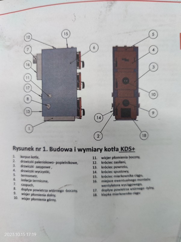 Szanowni koledzy, pozwoliłem sobie odświeżyć post na który nie otrzymałem odpowiedzi oraz uzupełnić go o dodatkowe informacje oraz zdjęcia 😉 Chciałem was prosić o pomoc w regulacji powietrza wtórnego i pierwotnego w moim kotle DS, może jakieś wskazówki które pozwolą jak najlepiej ustawić ten kocioł i proces spalania. Od miesiąca użytkuję kocioł DS Sekom KDS+, palę sezonowanym drewnem. Nie wiem jak poprawnie ustawić właśnie powietrze wtórne, a mam również problem z dymieniem na kotłownię podczas dokładania opału. Aktualnie PP jest regulowane miarkownikiem pod ruszt. Na wysokości rusztu jest dodatkowa rozeta, ale wg instrukcji to wizjer płomienia. Czy podczas spalania drewna zamknąć ją całkowicie czy zostawić tam małą szparę? Dodatkowa rozeta jest w środkowych drzwiczkach- zasypowych. Tutaj też nie wiem czy podczas palenia uchylać ją czy całkowicie zamknąć ? Przerobiłem już masę postów na forum, ale nie znalazłem jakiejś konkretnej odpowiedzi. Powietrze wtórne natomiast - boczne nr 8 (x2), tylne nr 17. Boczne mam otwarte na max po obu stronach, tyle natomiast delikatnie uchylone (tak jest w instrukcji). Nie ma tam natomiast żadnej informacji na temat tych rozetek w drzwiczkach. W komorze zasypowej zbierają się gazy i dym, więc chyba rozetka powinna być delikatnie otwarta? Będę wdzięczny ja pomoc w jakimś "początkowym" ustawieniu tego wszystkiego 😉 Jakie powinny być najlepsze ustawienia właśnie do drewna aby jak najlepiej kocioł je spalał oraz aby ograniczyć smołę w komorze zasypowej? Z góry dziękuję za pomoc;) -