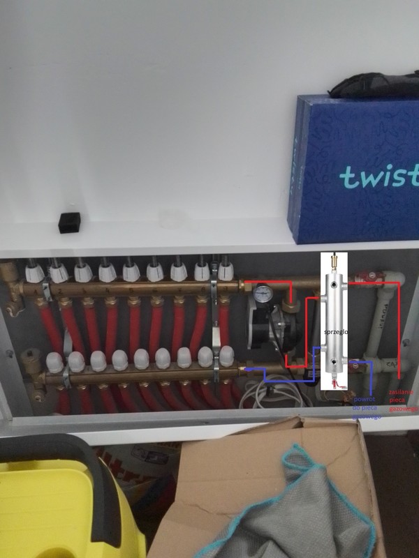 Witam, posiadam mieszkanie w zabudowie szeregowej: poziom -1 to garaz gdzie jest piec Termet Ecodance Gold Plus dwufunkcyjny oraz jeden kaloryfer poziom 0 to mieszkanie 91 m2 gdzie jest rozdzielacz jak na obrazku. Ogrzewaniem steruje sterownik temperatury TECH v292. W instalacji CO nie mam podlaczonego sprzegla. Nie wiem dlaczego ale po uruchomieniu ogrzewanie gdzie dziala pompa na rozdzielaczu i w piecu tylko na 3 rotametrach pojawia sie przeplyw na poziomie 1,5. Gdzie szukac problemu? Sprawdzilem ze zasilanie nie jest pomylone z powrotem. Jak usunalem pompe z rozdzielacza to pompa z pieca powoduje tylko przeplyw na jedym rotametrze. Jestem z Wroclawia, jezeli ktos zna dobrego specjaliste to prosze o namiary. Z tego co uzytkownicy pisali na forum to sama pompa z pieca powina ogarnac to wszystko -