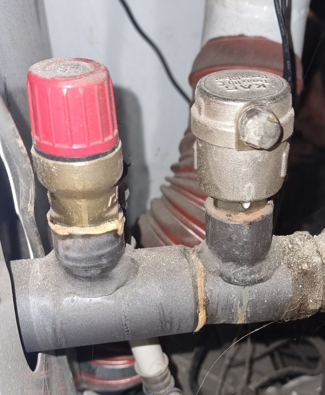 5. Dzień dobry, Czy możecie mi powiedzieć, co to są za elementy instalacji CO z kotłem na pellet (widoczne na zdjęciu dwa "zawory"). Ten z czerwoną górą, jak się go lekko przekręci, spuszczana jest woda z układu do kanalizacji. Ten obok, jak się odkręci małą, boczną zaślepkę, to kapie tam woda. Za co odpowiadają w instalacji CO? Czy zaślepka na tym z prawej strony ma być zakręcona? Pozdrawiam Piotr