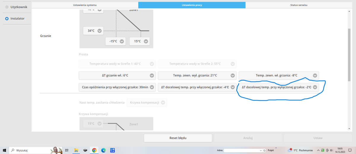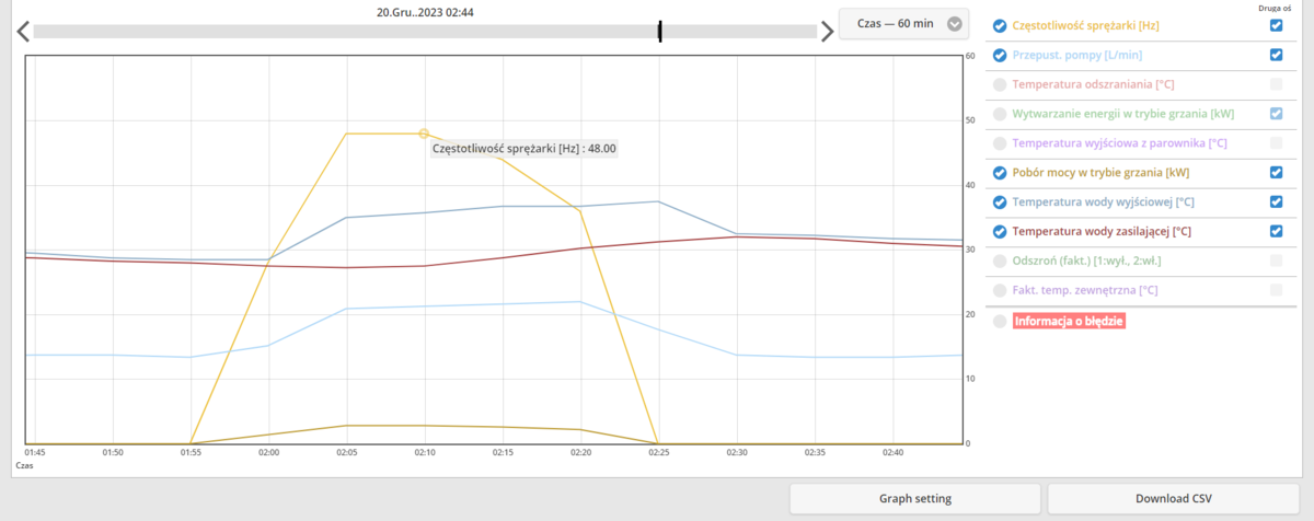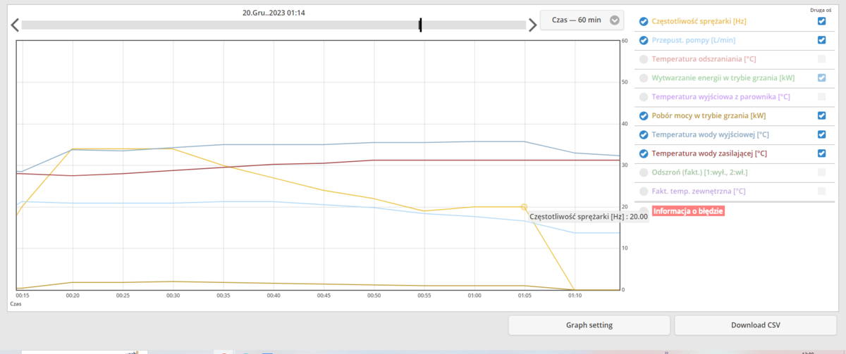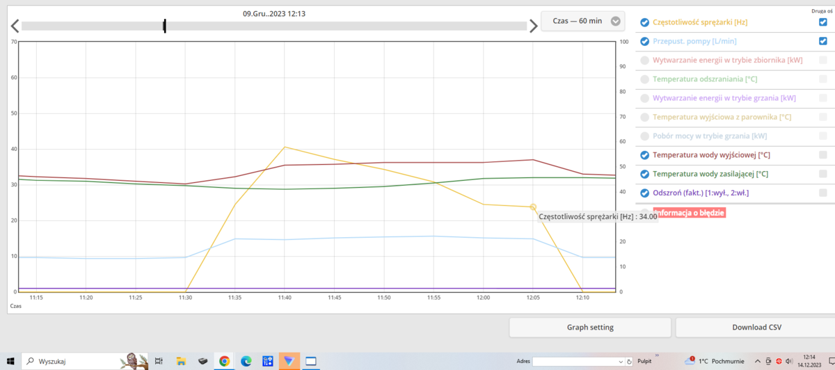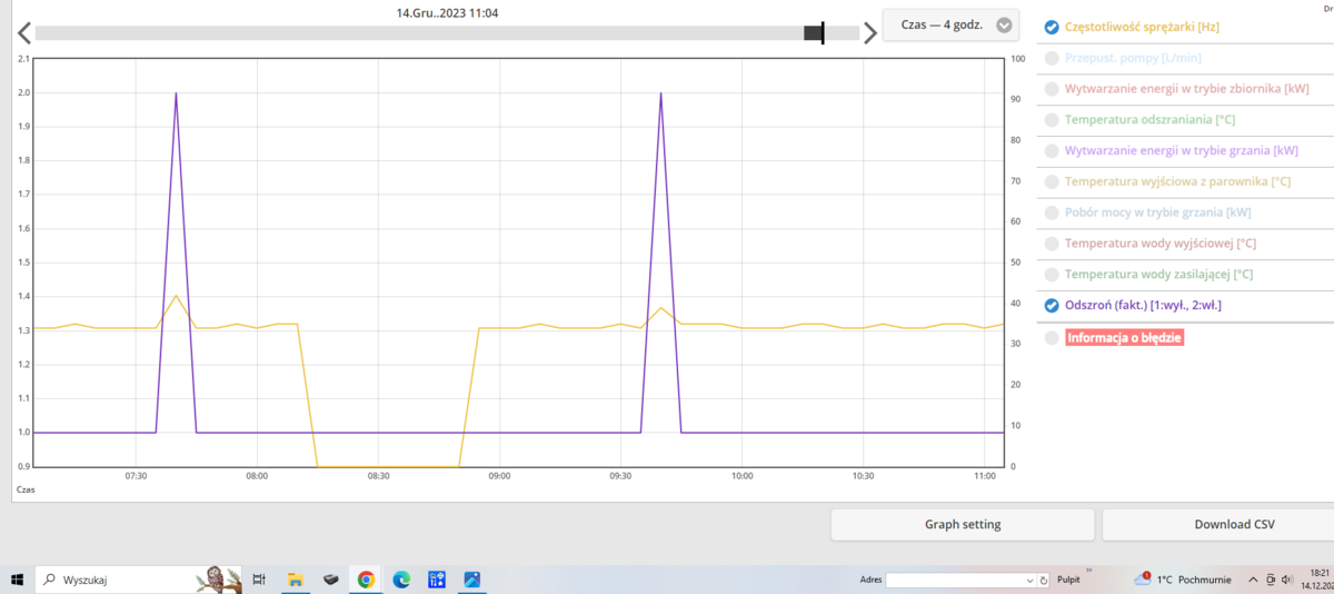 dom 200 metr. ściany pustak + cegła, docieplony 8 cm, strop ocieplony wełną 20 cm na skosach 25 cm na płasko, parter piętro, 100 % grzejniki stalowe purmo różnych mocy w sumie ok 15szt, pc tcap 9 kw monoblock, układ szeregowy , bufor na powrocie 170 l, grzeje CO i CWU -300 l, regulacja temperatury krzywa grzewcza 15-34, -15 -40, delta 6, max przepływ pompki obieg ok31 l/min, to jest jedyna pompka, wszystkie grzejniki ciepłe, temp. w domu piętro-24, parter -22, PC włacza sie na ok. 40 minut w trybie cichym ( bez trybu cichego na ok25 minut), przerwa 35 minut, przy obecych temp. 0,+2, wczoraj 12 defrostów,, przy kazdym defroscie liczy wł/wł sprężarki, łacznie w ciągu doby pewnie ze 25 x,