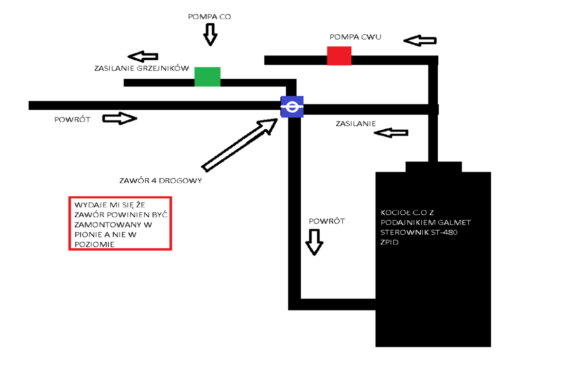 Witam. Potrzebuję Informacji , Pomocy odnośnie zainstalowanego u mnie Zaworu 4 drogowego firmy Afriso (Sterowany Ręcznie). Wydaje mi się że został on źle zamontowany ponieważ w momencie gdy ustawię go na 5 (tak jak na rysunku Nr.1)czyli podmieszanie To Kaloryfery robią się zimne czyli brak ogrzewanie. Wszystko wraca do normy jak ustawię go na Pozycję 1 , 2 lub maxymalnie 3 (Rysunek Nr.3) Na innych parametrach pojawia się brak ogrzewanie grzejników przejrzałem trochę Instalacji w Internecie oraz filmików i wszedzię jest on zamontowany w Pionie ( czyli tak jak na rysunku 2 ). Z Góry Dziękuje za Pomoc.