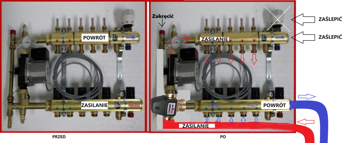 i dołorzyć mieszacz Esbe (ewentualnie dołożyć termometr na powrocie i odpowietrznik automat na końcu górnej belki).