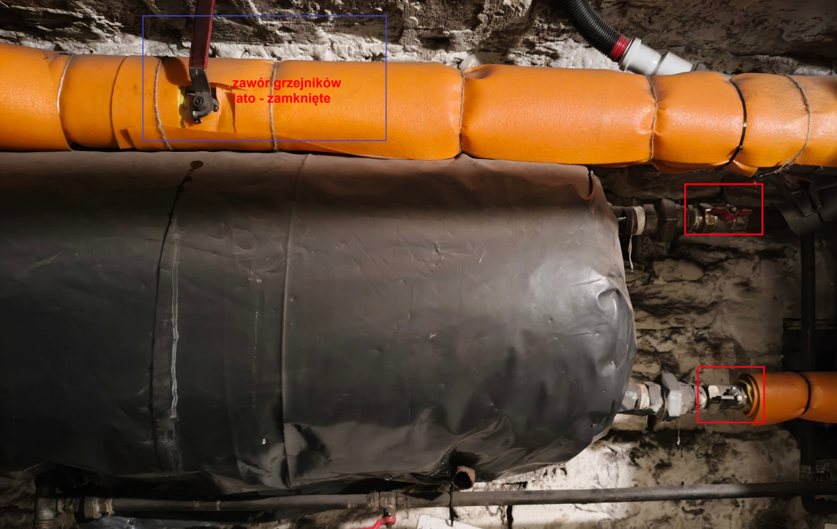 Cześć wszystkim. Mój bojler elektryczny dokonał żywota przez co jestem jakiś czas zmuszony do przepalania w piecu dla ciepłej wody użytkowej. Niestety Po przepaleniu drewnem jakieś 30-40 min woda następnego dnia jest już chłodna, a nawet po jednej dłuższej kąpieli. Podejrzewam że ma to związek z obiegiem grawitacyjnym C.W.U -> piec, ponieważ grzejniki mam wyłączone za pomocą zaworu (widoczny na zdjęciu w niebieskiej ramce). 1. Który z zaworów oznaczonych czerwoną ramką muszę zakręcić aby zatrzymać obieg grawitacyjny? Myślę nad zakręceniem górnego - i czy musi odbyć się to po zakończeniu palenia czy jeszcze w trakcie gdzie na piecu jest np 70 stopni? 2. Posiadam jedną pompę obiegową CO na zasilaniu- czy w przypadku palenia wyłącznie na CWU musi ona chodzić, czy grzać wyłącznie grawitacją? Z góry dziękuję za udzielone odpowiedzi, pozdrawiam