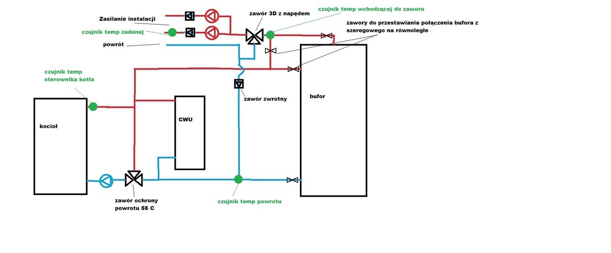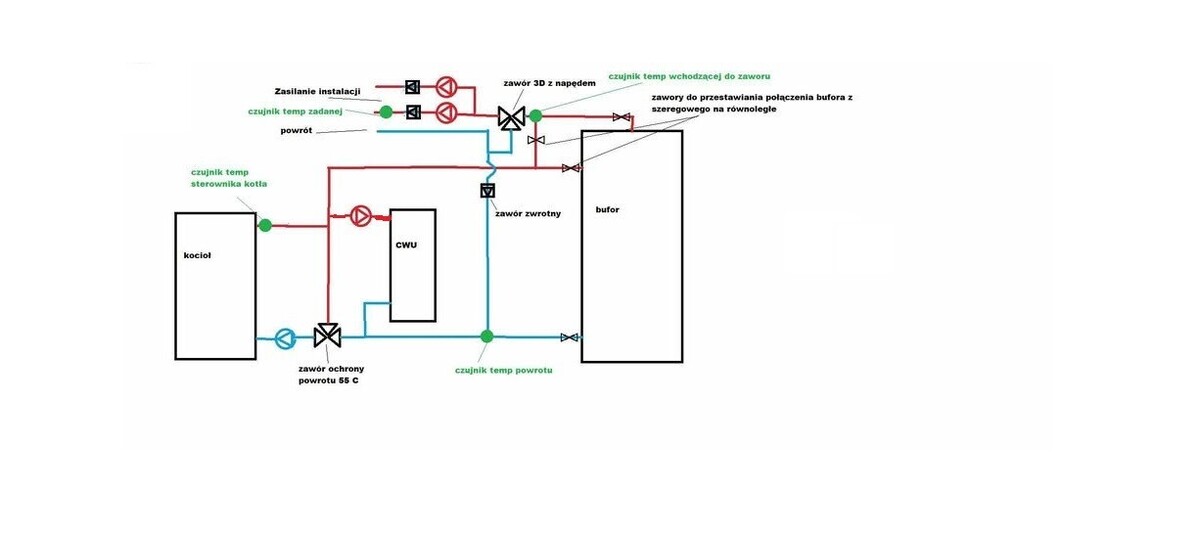 Witam wszystkich:) Mam problem z obiegiem wody w instalacji CO. Wrzucam najpierw schemat mojej kotłowni, poniżej wszystko opiszę.