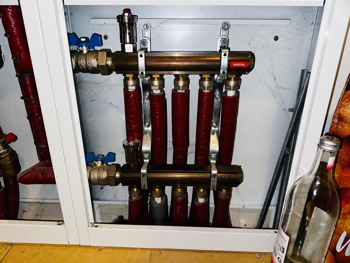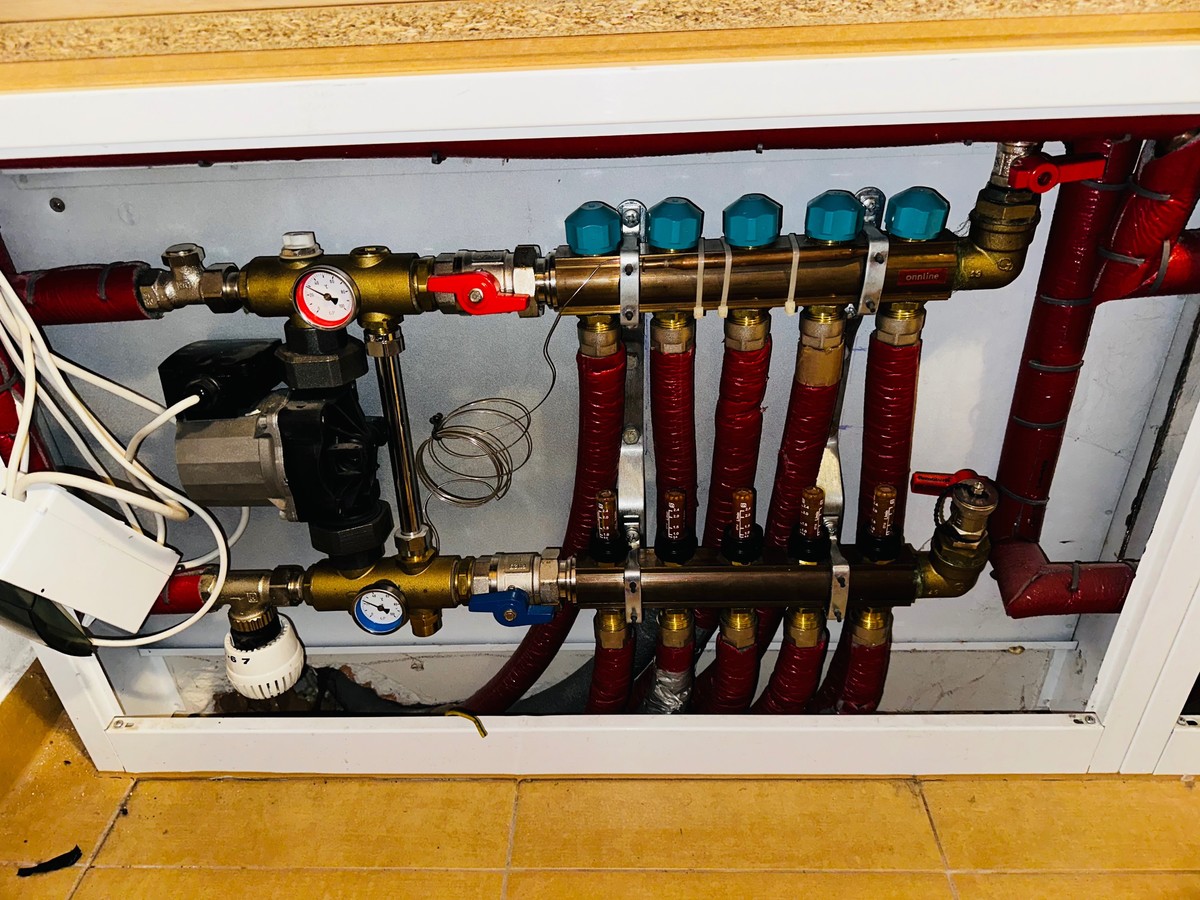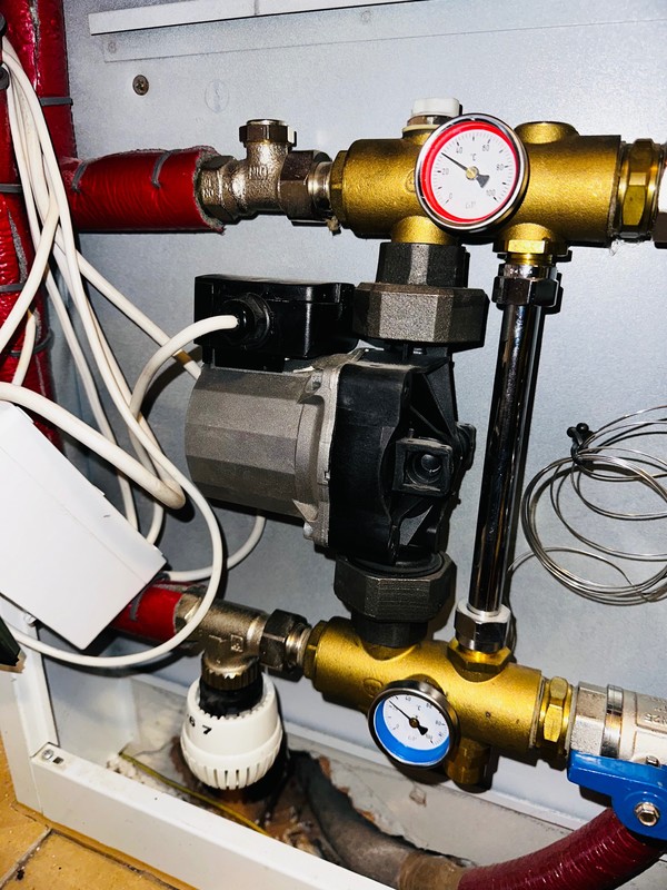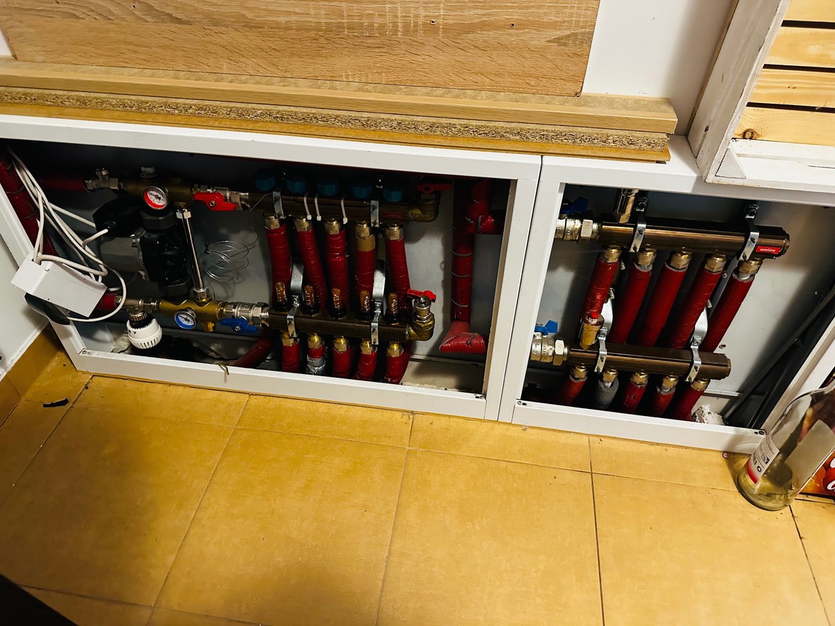 2. Cześć, ponownie wielkie dzięki za odpowiedź. Postaram się poniżej odpowiedzieć na Twoje pytania: 1) Na parterze jest wszędzie ogrzewanie podłogowe (salon, korytarz, mała toaleta, kuchnia). Łącznie około 55 m2 powierzchni pomieszczeń. Niestety długość pętli nie jestem w stanie powiedzieć, dok kupiłem we wrześniu tego roku jako używany (wybudowany rok 2016). 2) na górze jest również podłogowe ogrzewanie w łazience + kaloryfer ścienny. W 3 pokojach na górze są wszędzie kaloryfery. 3) rozdzielacze są dwa (zdjęcie wklejam poniżej) jeden na dół, drugi na górę. 4) pompa (zdjęcie również poniżej) firmy WILO typ R5266 KuP 5) sterownik jest na dole wspomniany przeze mnie Euroster bez dodatkowego czujnika (sterownik sam w sobie posiada czujnik temperatury - jeżeli dedukuje to poprawnie 😀). Do kaloryferów na górze jest czujnik i sterownik temperatury firmy TECH model ST 292v2 6) siłowniki na rozdzielaczu ? Nie wiem - zdjęcie w załączniku obu rozdzielaczy Co miałeś na myśli z niskimi temperaturami w domu ? Na podstawie tej temperatury załączenia pompy ? Dziękuje z góry i pozdrawiam.