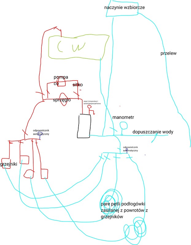 Witam piszę z problemem świeżej instalacji co. Mam problem z ciągle zapowietrzająca się pompką CO. Na wstępie dodam że w garażu mam nieszczelny grzejnik z którego kapie woda, lecz na bierzaco dolewałem wody do instalacji, oraz grzanie wody w bojlerze jest narazie zakręcone. Przez pierwszy miesiąc było wszystko okey aż do momentu pierwszego zapowietrzenia się pompki przez co zagotował się piec i na szczęście zadziałały zabezpieczenia. Po ponownym uruchomieniu instalacji i kotła cały czas słychać powietrze w układzie, co chwilę słychać powietrze w pompce i sie zapowietrza, co jakiś czas słychać też bulgoczące powietrze w naczyniu wzbiorczym. Sitko przy pompce czyszczone, dziurawy grzejnik odcięty na rozdzielaczu. Poradzicie co może z tym chodzić bo cały dzień muszę siedzieć w kotłowni i pilnować pieca, i aż po nocach śni.mi się to. Dołączam schemat instalacji. Oraz zdjęcia.