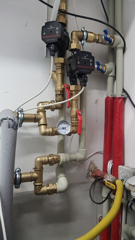 Mam zamontowany kocioł niedźwiedź , który obsługuje tylko podłogówkę na parterze i piętrze i do tego zasobnik na CWU. Na wyjściu z kotła dwie pompy jedna do CO druga do CWU na wspólnym rozdzielaczu. Przy rozdzielaczach podłogówki pompy razem z zaworami mieszającymi.