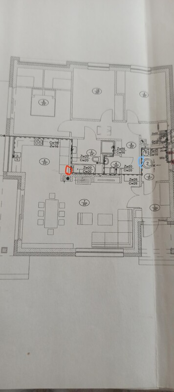 1. Witam instalacja chce zrobic w systemie rozdzielaczowym, tylko mam zagwostke czy dać rozdzielacz w kotłowni (kolor niebieski na zdjęciu) i dołożyć 3 belkę na cyrkulację , czy lepiej dać rozdzielacz w kuchni za lodówka (zaznaczony na czerwono) i zrobić tylko cyrkulację rozdzielacz - zasobnik (rura 16) bo do punktów poboru będzie już blisko . Srednicę rur zasilanie do rozdzielacza 25 , a od rozdzielacza wszystkie 16 tylko wanna i prysznic bym dał 20 ewentualnie zimna woda do zlewu 20 bo będzie zmywarka wpieta w to samo oczko . Któro rozwiązanie jest lepsze?