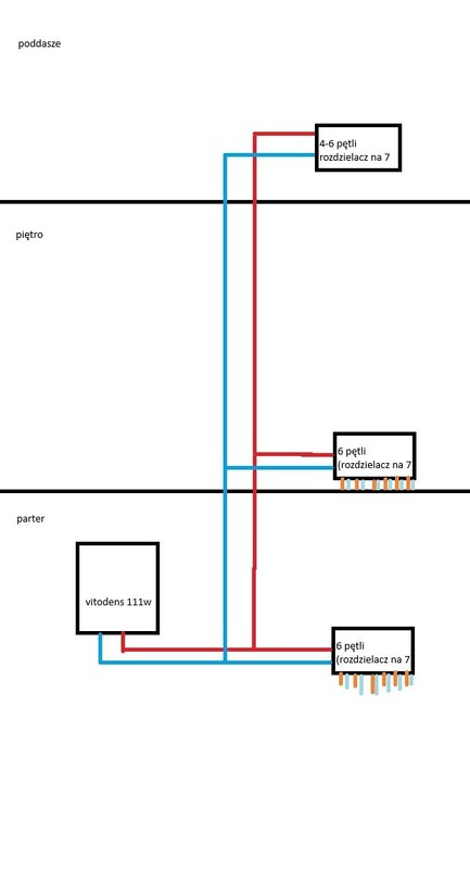 Mam segment który ma 3 kondygnacje ok 130m2 (pietro + parter) i 30-40m2 (poddasza), na każdej chciałbym mieć ogrzewanie podłogowe. Na parterze i piętrze ogrzewanie już zostało wykonane przez dewelopera, jednak jest ono niedokończone - brak spięcia z piecem. Na poddaszu mam zamontowany rozdzielacz i podpięte zasilanie i powrót - pętli jeszcze brak bo nie wykończone.