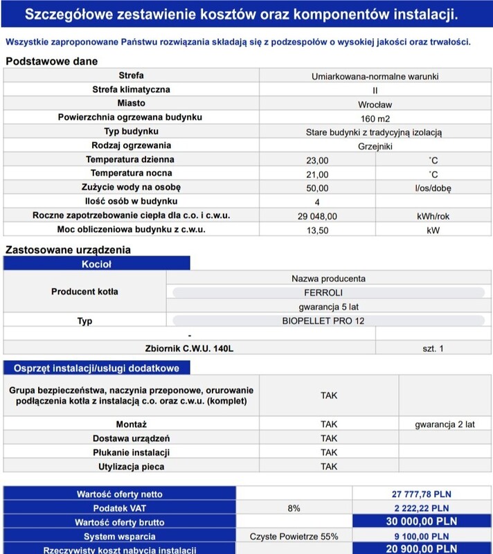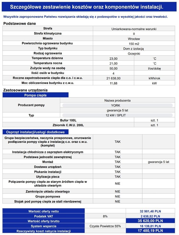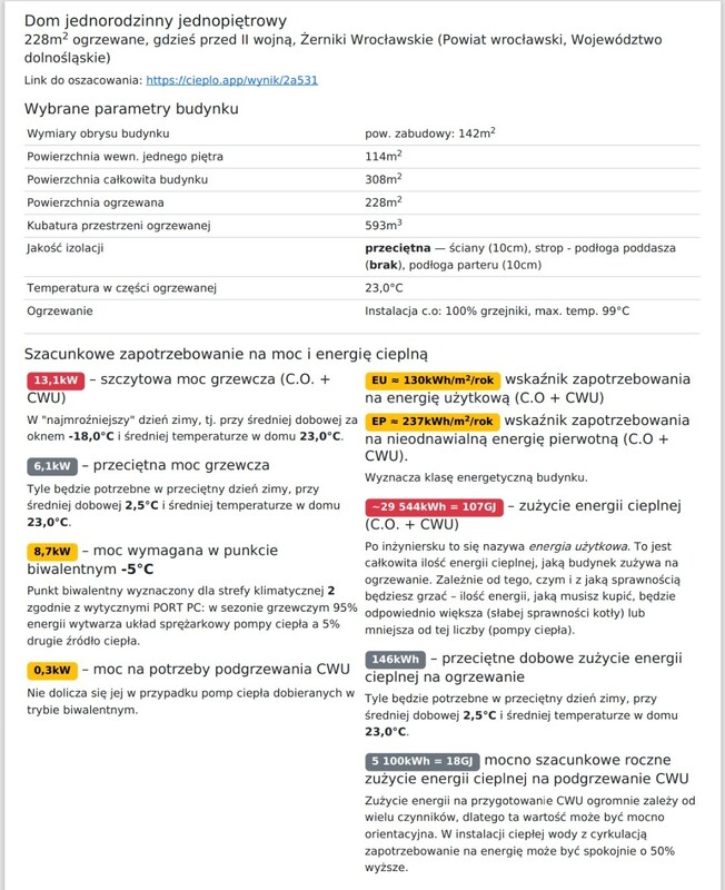 Poniżej parametry budynku z app ciepło oraz przykładowa oferta pompy i ceny.