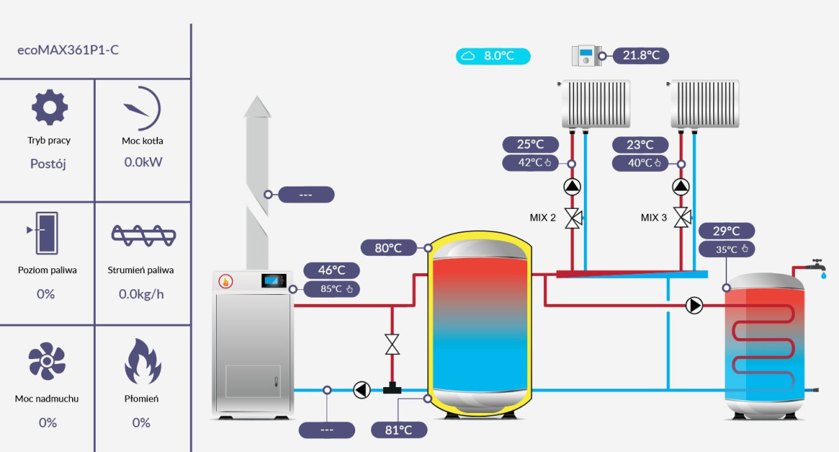 3. każda grupa ma swój sterownik pokojowy x40, pompy zatrzymuję bo po wygrzaniu bo obniżenie 5st rozładowuje bufor nie wiele wolniej niż na zadanej 42